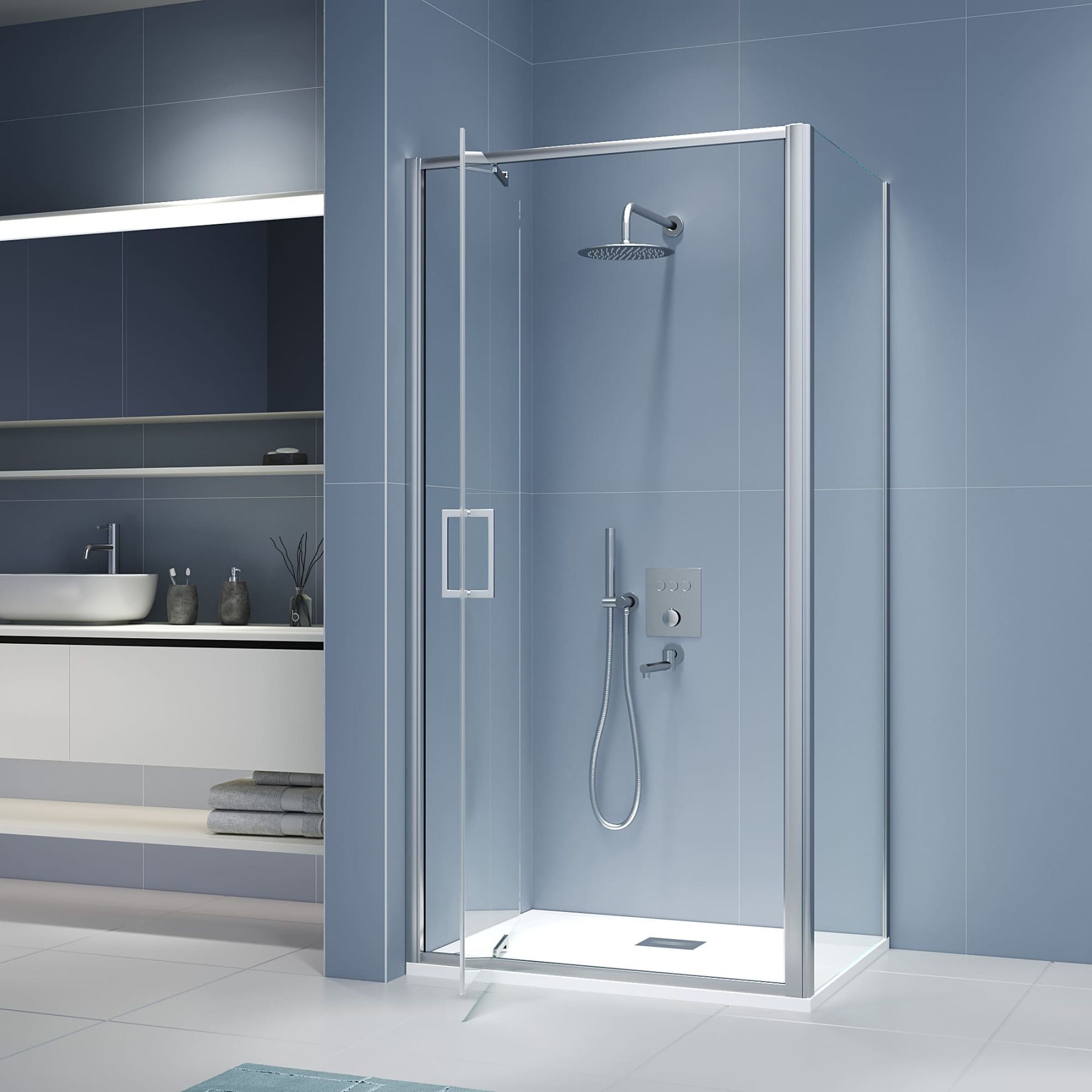 Душевой ОГРАЖДЕНИЕ прямоугольной формы создано для организации вместительной прямоугольной душевой зоны из стекла в алюминиевом каркасе, с распашной дверью наружу, большая часть двери за счет уникального механизма перпендикулярно заходит во внутреннее пространство душевой зоны. Душевой угол — это идеальная душевая кабина минималистичного дизайна и комплектации, монтируется к стене помещения душевой зоны регулирующими профилями.