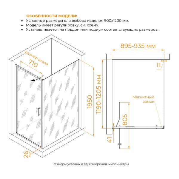 Магнитный замок в мягком силиконовом профиле качественно герметизирует вход. Регулируемый профиль позволяет настроить размер душевого уголка под неровности стен в ванной комнате.