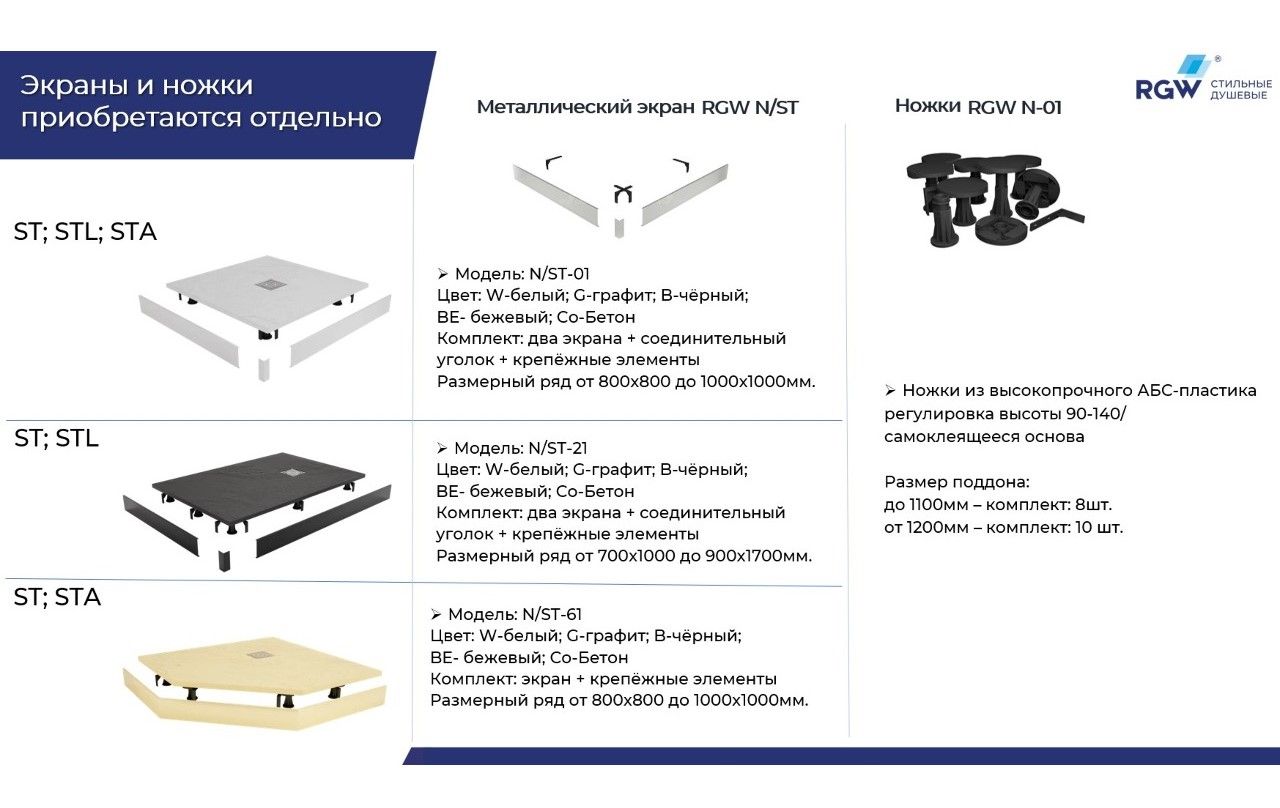 - Комплект из 10 шт. Ножки для поддона RGW N-10 Черные 03230111-31 (для поддонов длиной от 1200 мм включительно).