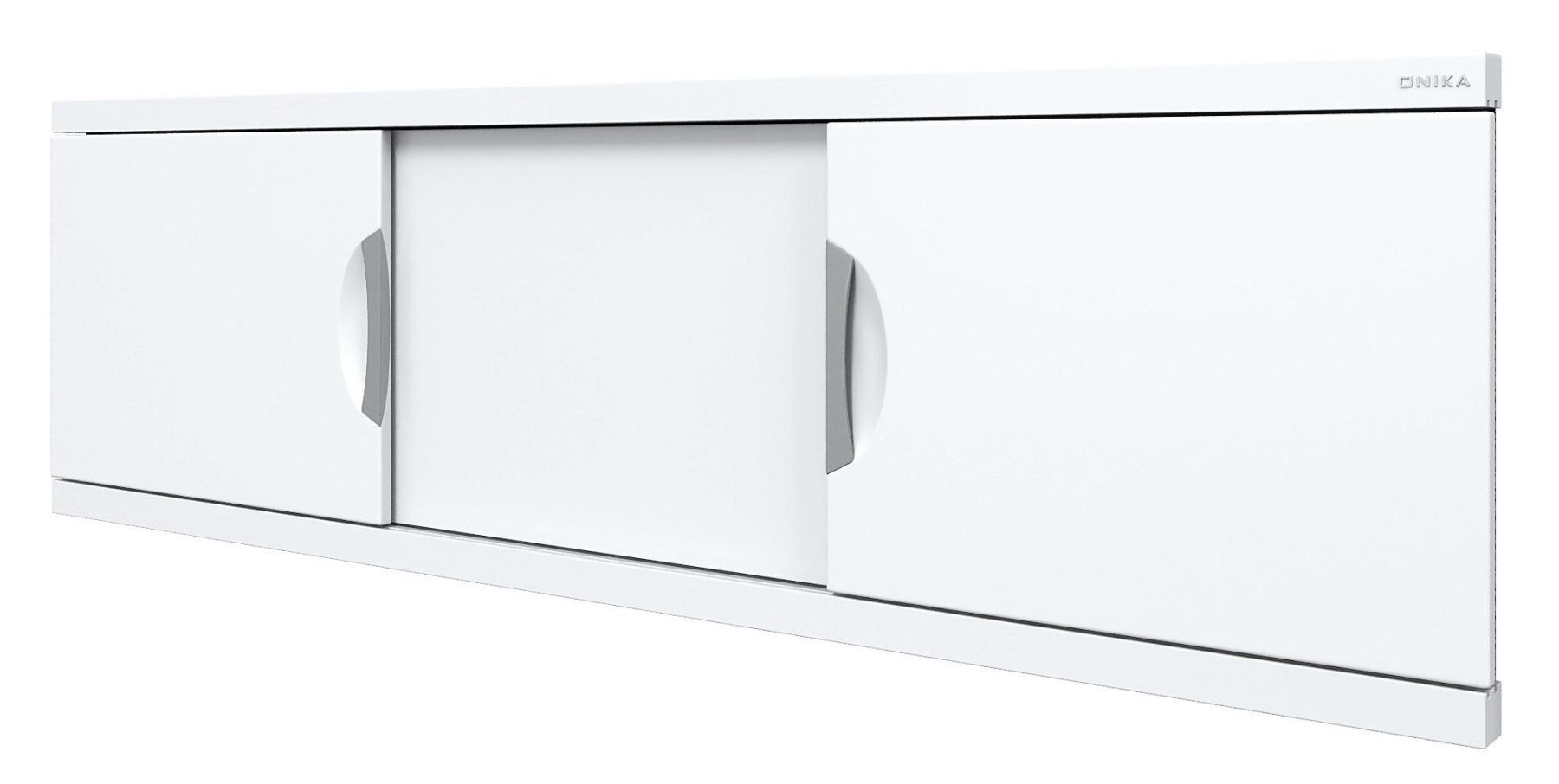 Конструкция имеет три подвижные раздвижные двери из МДФ, покрытых высокоглянцевой белой пленкой. Две боковые дверцы с врезными хромированными металлическими ручками.