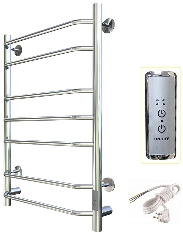 Внимание! Для скрытого монтажа электропроводки необходимо приобрести комплект скрытого подключения. Полотенцесушитель электрический комплектуется ТЭНом с терморегулятором и таймером. Изделие производится из нержавеющей стали AISI 201. Вертикальные трубы d -32 мм., для горизонтальных вставок используется труба d — 18 мм. Нагревательным элементом в полотенцесушителе является ТЭН. Полотенцесушитель заполнен бытовым антифризом.Экономичность: ТЭН нагревает антифриз до нужной температуры и выключается, далее при остывании полотенцесушителя он включается опять. Таким образом он работает не постоянно, и получается, что ТЭН потребляет электричество не 300 Вт, а порядка 100 — 150 Вт.Мощность электрического прибора порядка 100 Вт при стоимости 1 Вт — 5 руб несложно посчитать: 100Вт х 24 = 2,4 кВт в сутки. Стоимость эксплуатации изделия за сутки 2,4 кВт х 5 руб. = 12 руб. При максимальной температуре расход электричества за 30 дней составит порядка 360 руб. При условии если сушка работает круглосуточно на максимальной температуре.Удобство монтажа: Полотенцесушитель крепится к стене на четыре держателя. Изначально ТЭН не установлен в полотенцесушитель для безопасной транспортировки, его можно установить, как справа, так и слева предварительно перевернув полотенцесушитель вверх ногами и выкрутив заглушку с нужной стороны на место в которое установится ТЭН.Примечание. Внимательно изучите инструкцию по установке ТЭНа!Скрытое подключение: Для скрытого монтажа электропроводки необходимо приобрести комплект скрытого подключения.Подключение в розетку: В комплекте с ТЭНом имеется шнур с вилкой, который будет необходим при подключении к розетке.