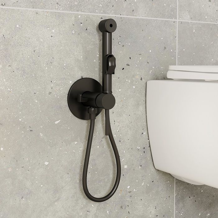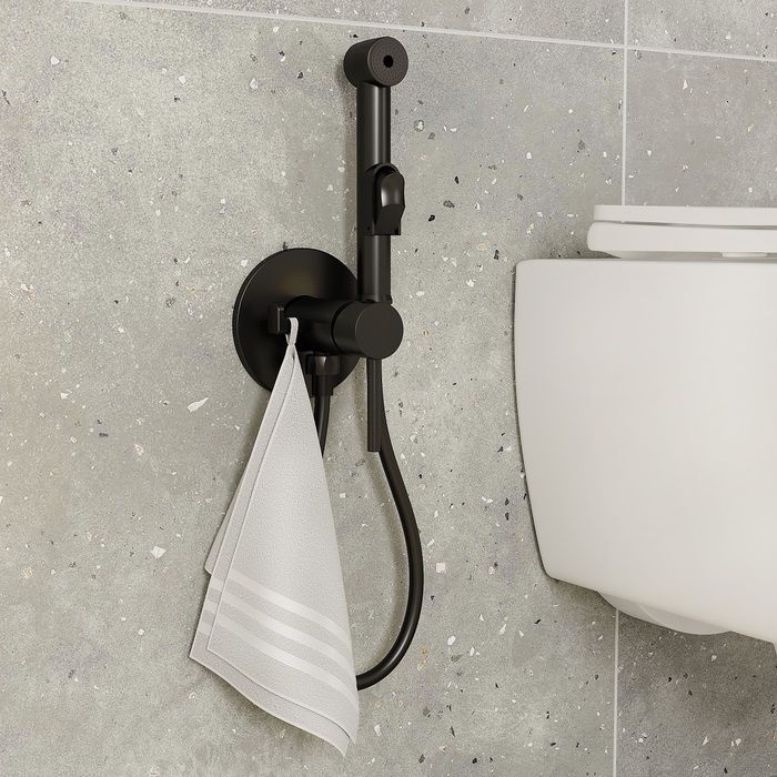 Встраиваемый смеситель с гигиеническим душем в стильном матовом черном цвете станет отличным дополнением современной ванной комнаты, привнесет в нее комфорт и эстетику. Имеет крючок для полотенца. Крючок и держатель для лейки при необходимости можно поменять местами. Гигиеническая лейка и гладкий душевой шланг длиной 1,2 метра в комплекте. Экономит пространство и упрощает уборку — благодаря скрытому монтажу в стену (на глубину 40-60 мм) и отсутствию больших выступающих элементов конструкции. Подключается с помощью любых труб, диаметр входных отверстий ½ дюйма.