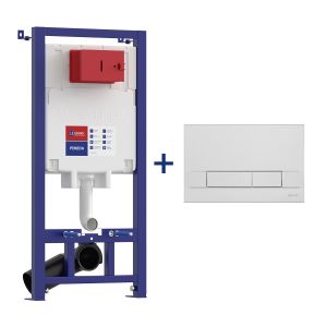 Комплектация: система инсталляции на монтажной раме, бачок скрытого монтажа с запорным вентилем, кнопка смыва, комплект креплений, патрубков для подключения к унитазу, шпильки, фановый отвод для канализации, инструкция.