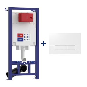 Комплектация: система инсталляции на монтажной раме, бачок скрытого монтажа с запорным вентилем, кнопка смыва, комплект креплений, патрубков для подключения к унитазу, шпильки, фановый отвод для канализации, инструкция.