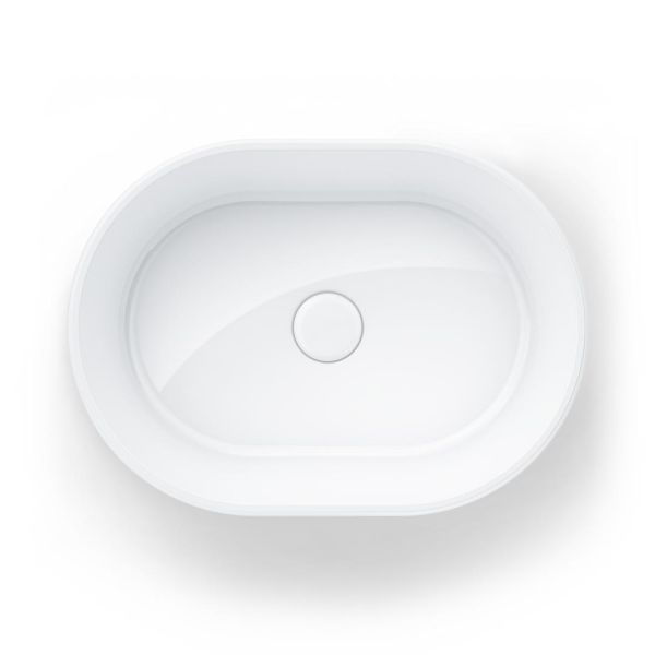 Белая глянцевая накладная раковина без отверстия под смеситель, ширина 50 см. Донный клапан не входит в комплект. Раковина устанавливается на тумбы и на столешницы. Возможно использование с высокими смесителями или со смесителями, монтирующимися в стену.