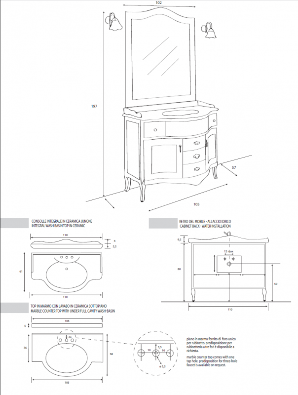 Керамическая раковина Cezares с тремя отверстиями Junone JU110.3 GIU200110/ALZAT