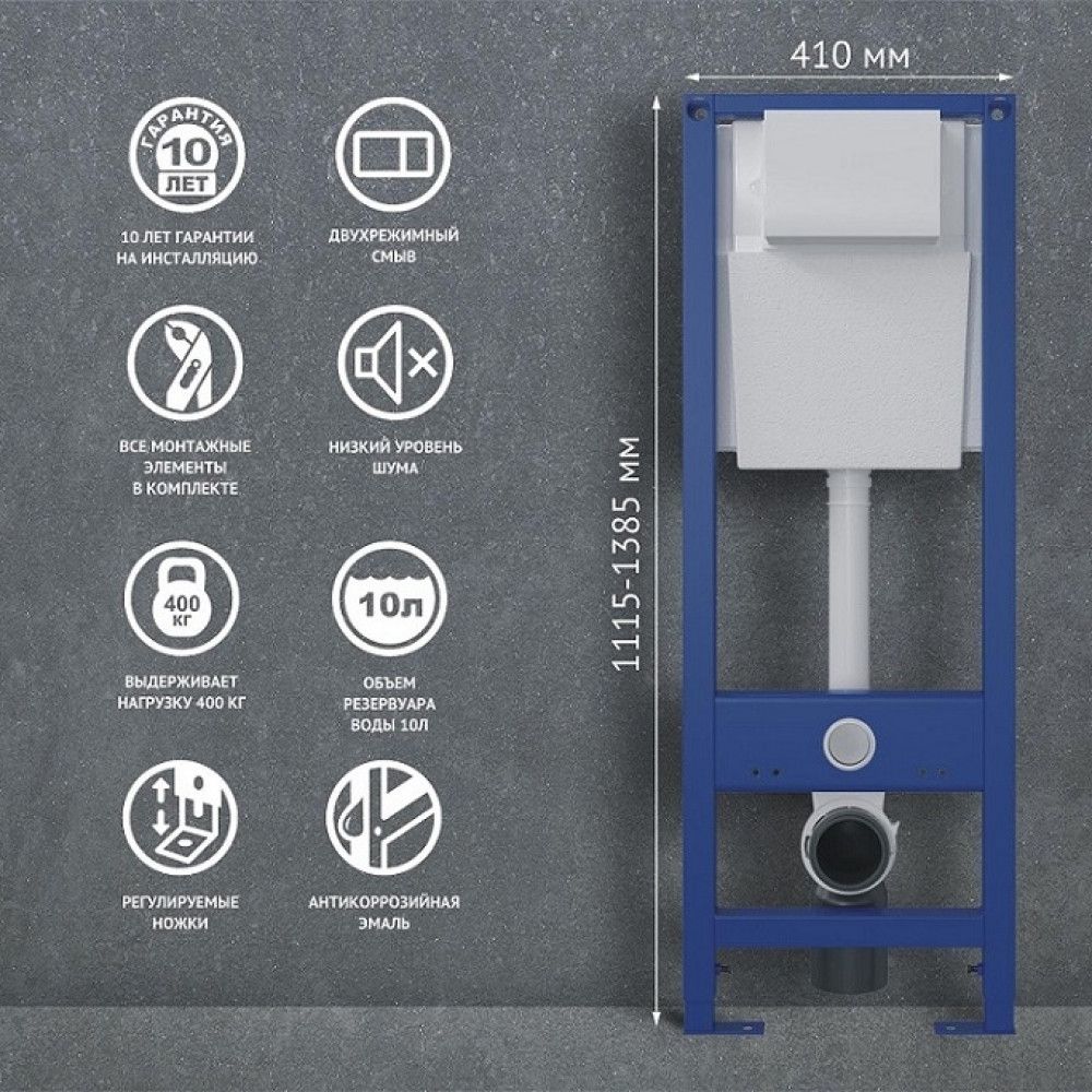 Полный Комплект ATOM Line для монтажа подвесного унитаза: инсталляция, cтальная рама с антикоррозийным покрытием, кнопка черная Soft Touch, унитаз VENTAS Rimless, сидение дюропласт Ventas Slim SOРасчётная нагрузка до 400 кг.Ножки c регулировкой высоты.Межосевое расстояние под крепежные шпильки унитаза 18 и 23 см.Бачок с функцией шумоподавления.Двухрежимная кнопка смываЭконом слив 3л, полный слив настраивается от 5,5 до 8,5л Монтажный кнопочный узел, полный комплект патрубков, лекала для монтажа отверстий; унитаз VENTAS: безободковый смыв, сидение дюропласт Ventas Slim SO: микролифт, быстросъемное. Все крепежи для установки в комплекте. Гарантия 10 лет.
