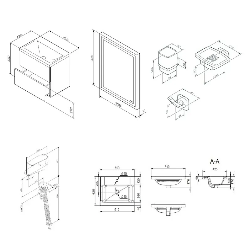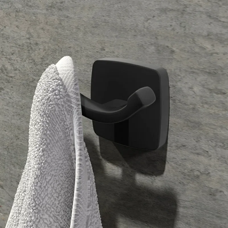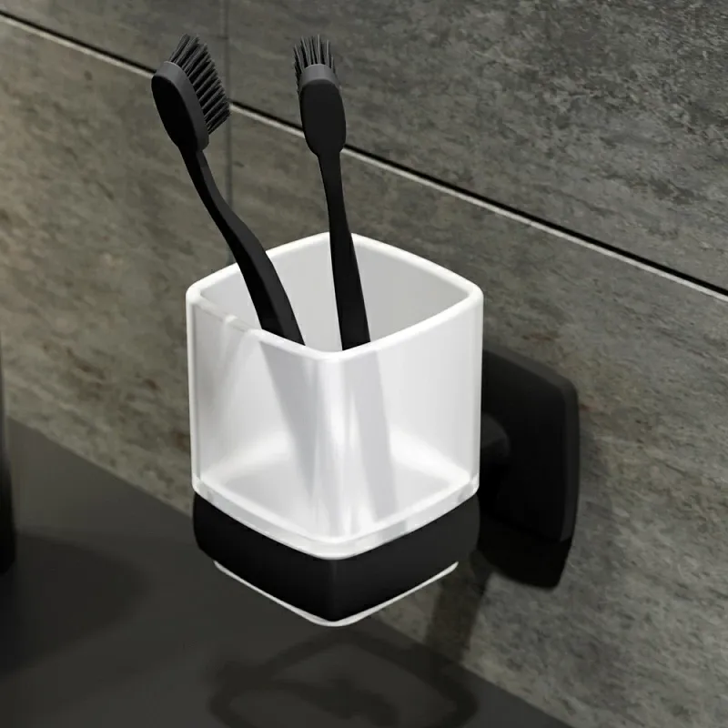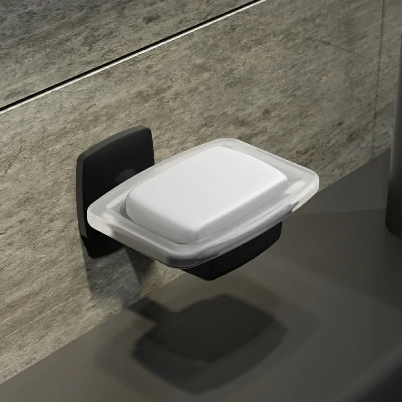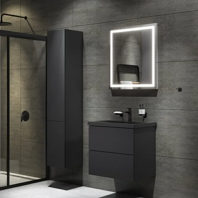 Комплект включает универсальное зеркало с контурной LED-подсветкой, которое создает равномерное освещение и визуально расширяет пространство. Аксессуары — стеклянные стакан и мыльница с держателями, а также двойной крючок для полотенец — выполнены в едином стиле, подчеркивая целостность композиции. Матовое черное покрытие всех элементов устойчиво к влаге и механическим воздействиям, сохраняя безупречный вид надолго.