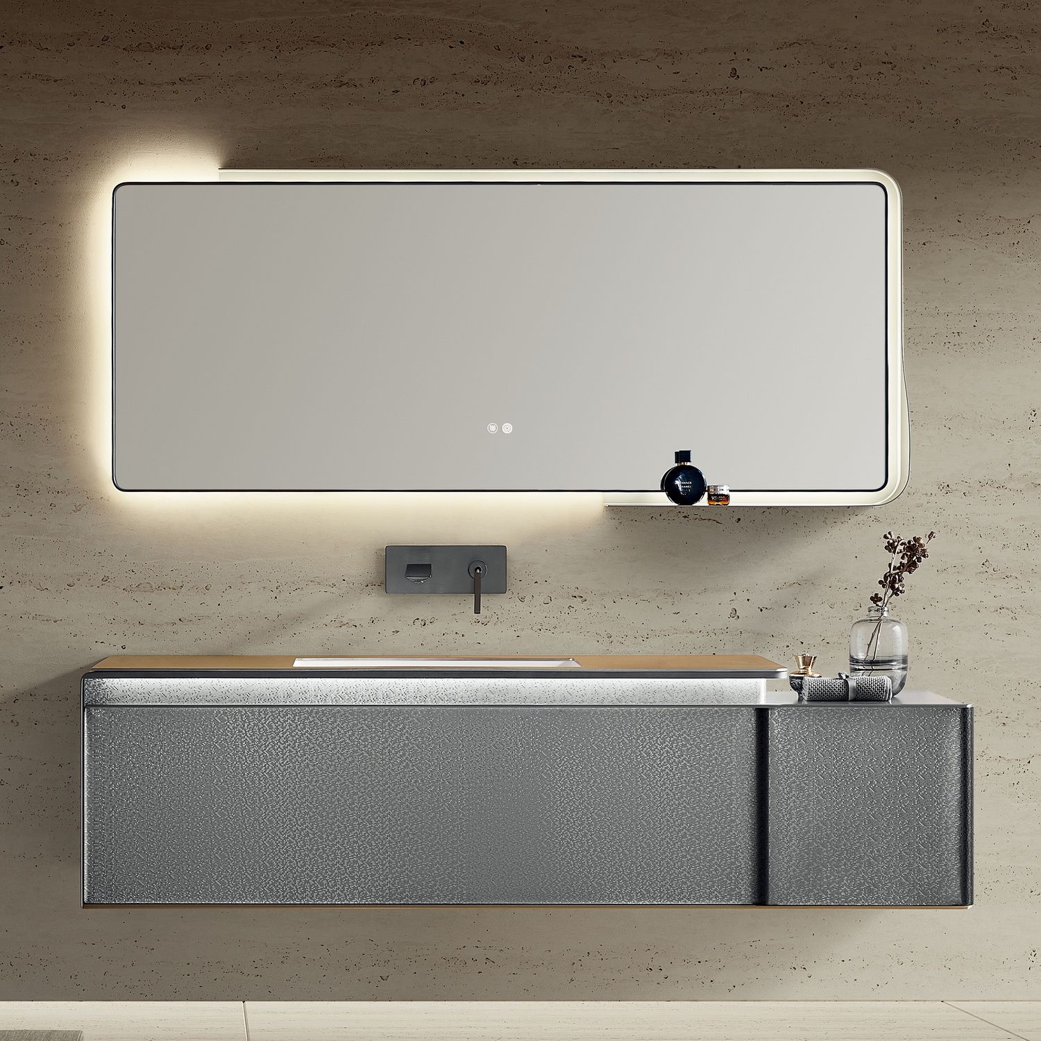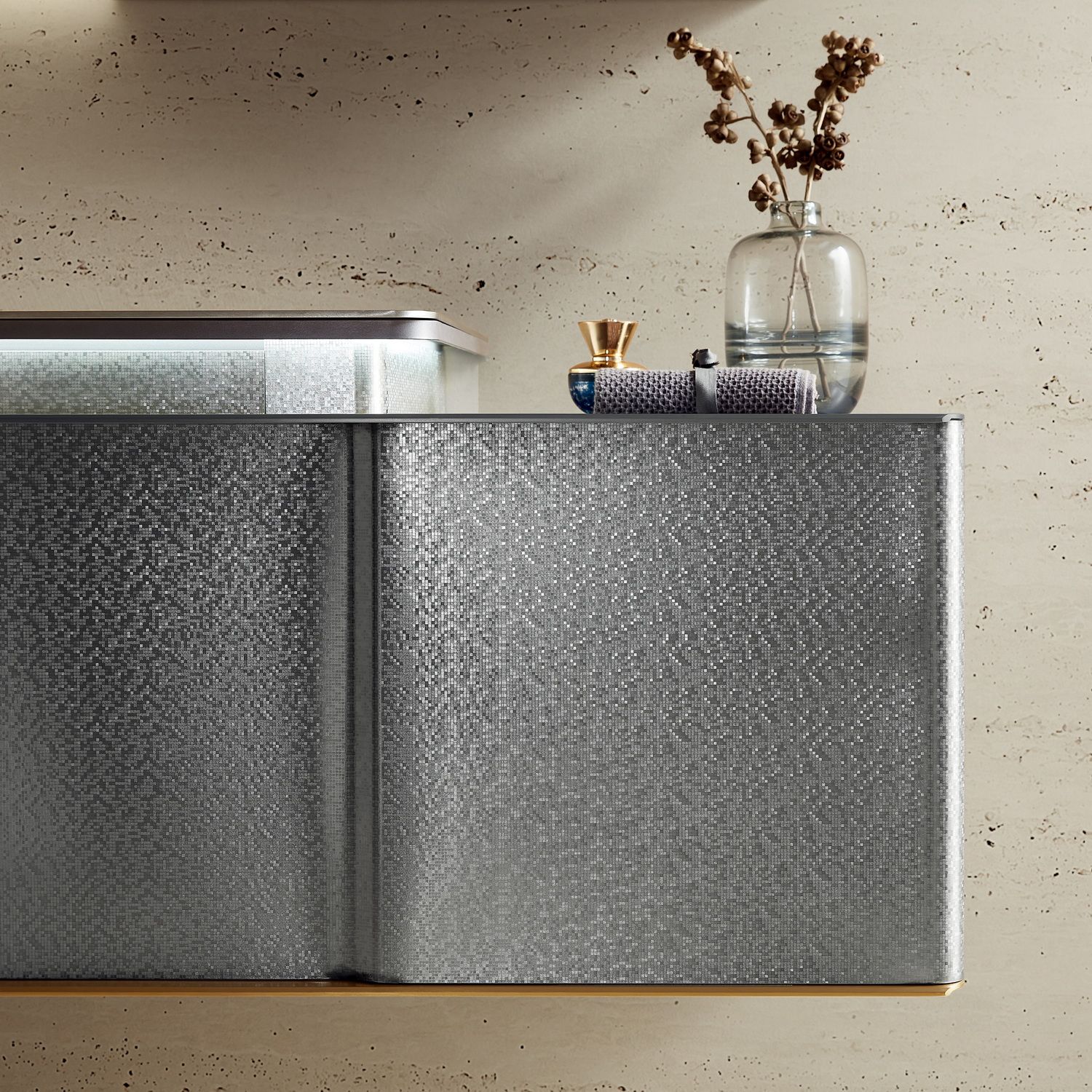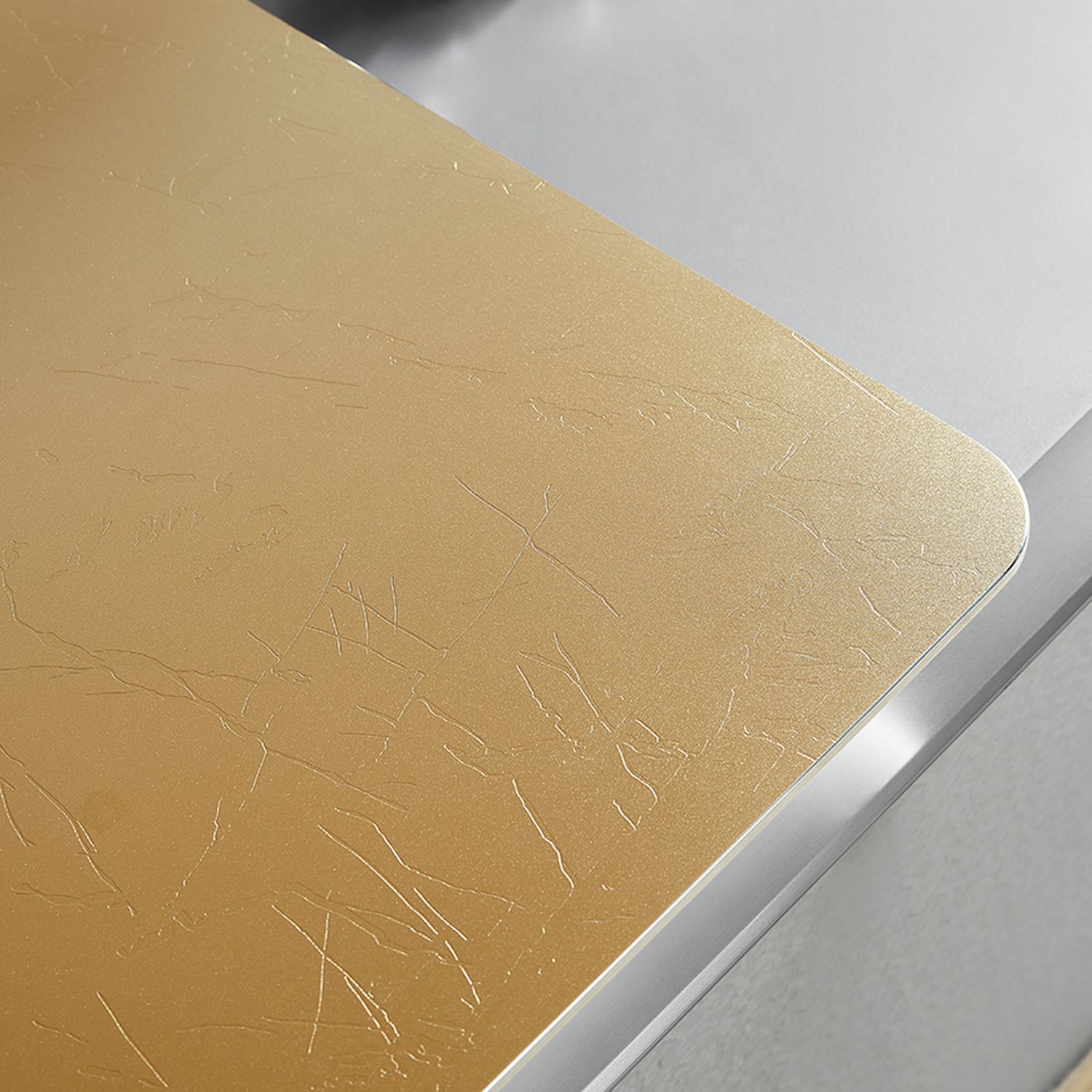 Тумба изготовлена из нержавеющей стали, которая включает основание из алюминиевых сот для увеличения шумоизоляции и придания жесткости конструкции, а поверх листов из нержавеющей стали SUS 304 нанесен дополнительный антикоррозионный слой и финальным напылением наносится краска. Раковина – столешница золотистого цвета выполнена из листа нержавеющей стали с дополнительной гальванизацией для дополнительной защиты покрытия и создания эффектного блеска. Чаша изготовлена из искусственного камня на основе минералов Corian с донным клапаном хромированного цвета в комплекте. Для хранения предусмотрен один выдвижной ящик на направляющих компании Hettich рассчитанных на 80 000 циклов открывания. Зеркало с подсветкой и функцией антизапотевания идет в комплекте с мебелью, основание под полотно изготовлено из нержавеющей стали.