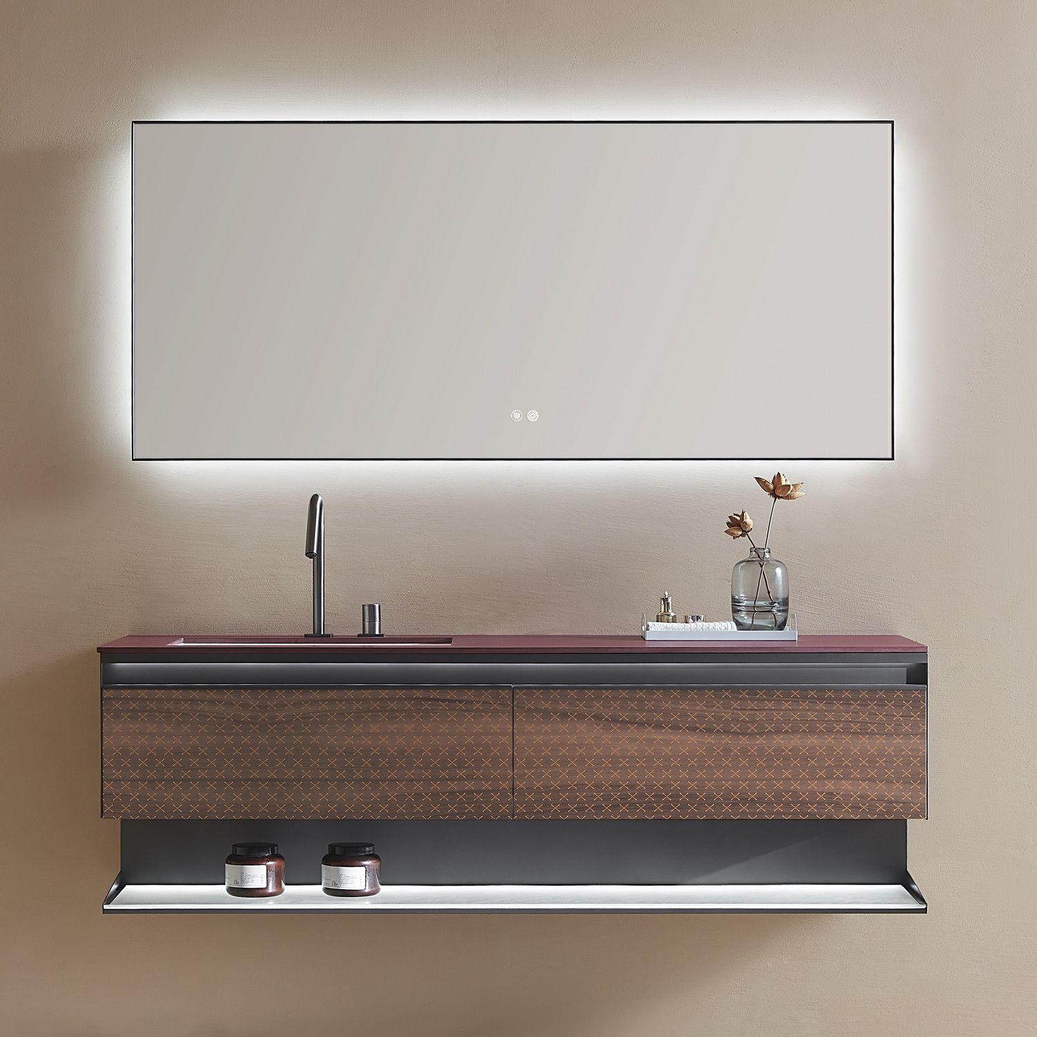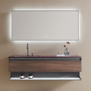 Данное изделие из премиальной линейки изготовлено из высокоресурсных и износостойких материалов.Тумба выполнена из многослойного листа, включающего основание из алюминиевой решетки в форме сот для звукоизоляции и дополнительного ребра жесткости, поверх которого крепятся листы из нержавеющей стали SUS 304.Также дополнительно наносится слой антикоррозионного состава и в заключении осуществляется покраска влагостойкой эмалью. На фасадах установлены панели из массива дерева обработанные деликатным травлением, для придания яркости текстуры волокна. Столешница изготовлена из итальянских панелей Fenix, которые производят из натурального камня и отличаются повышенной износоcтойкостью , а чаша выполнена из искусственного камня на основе минералов – Corian.Для хранения предусмотрены два выдвижных ящика, оснащенных механизмом открывания Unihopper,а также в нижней части базы расположена открытая ниша с антуражной подсветкой, которая срабатывает при приближении человека от 3-х метров. Зеркало имеет основание из листа нержавеющей стали и оснащается контурной подсветкой , а также функцией антизапотевания.