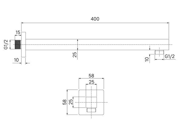 Хромированный настенный кронштейн для верхней душевой лейки. Квадратное сечение, длина 400 мм. Совместим с любыми хромированными верхними лейками IDDIS® с подключением G 1/2, а также с лейками других производителей.
