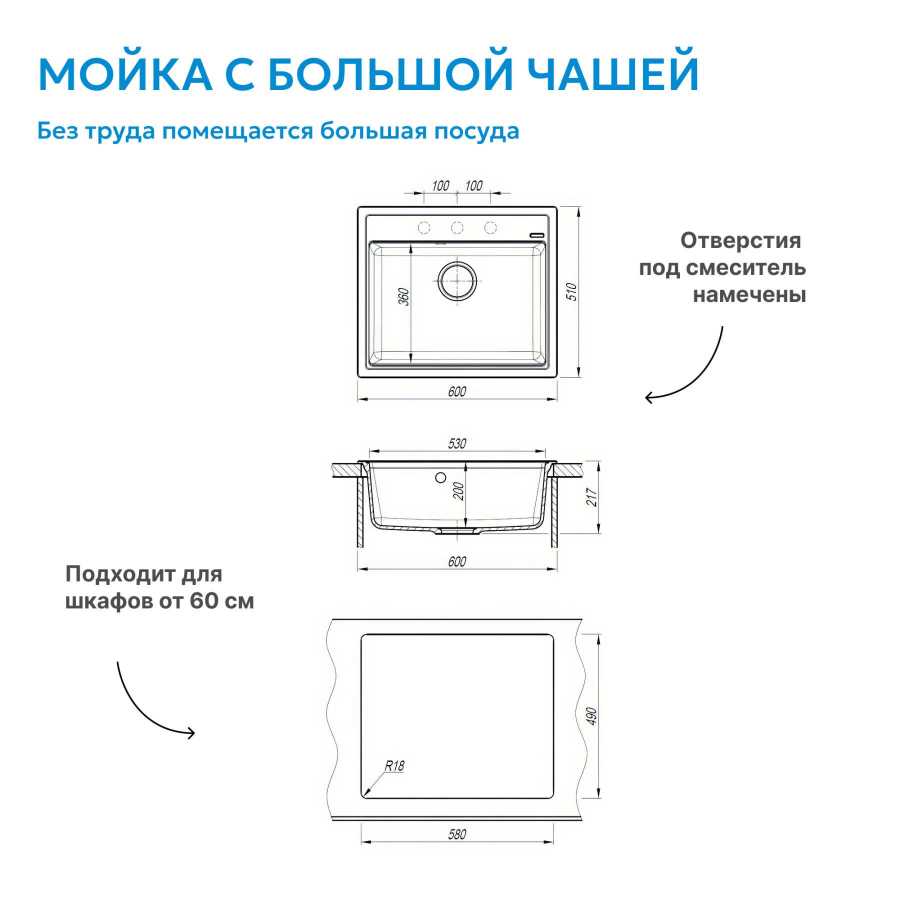 Удобство монтажа — предусмотрено намеченное отверстие под смеситель, что облегчает установку и позволяет выбрать оптимальное положение.