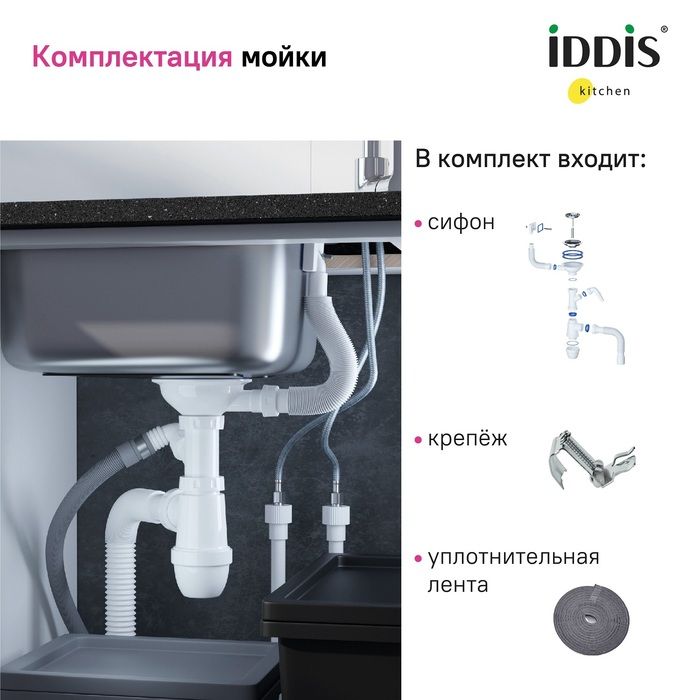 Сифон с отдельным отводом для стиральной/посудомоечной машины с обратным клапаном и гофрированными отводами для удобства подключения. Гарантия на стальные мойки IDDIS® – 15 лет, на сифон – 2 года, на крепления – 1 год.