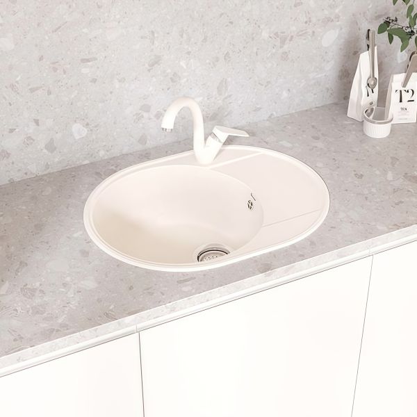 Овальная мойка Maretti Kitchen?KT610-WH белого цвета — оптимальное решение для компактной кухни. Модель оснащена круглой чашей и плоским крылом, которое можно разместить слева или справа (реверсивная конструкция). Изделие изготовлено из искусственного камня — композита на базе натурального мрамора и связующих смол. Такой материал эффективно приглушает шум падающей воды. Поверхность защищена покрытием гелькоут: оно устойчиво к царапинам и загрязнениям, упрощает уход. Мойка подходит для шкафов шириной от?50?см и встраивается в стандартную столешницу (60?см). Это даёт свободу при планировании кухонного пространства. Гарантия производителя — 1?год, а при правильном уходе мойка прослужит свыше?10?лет.