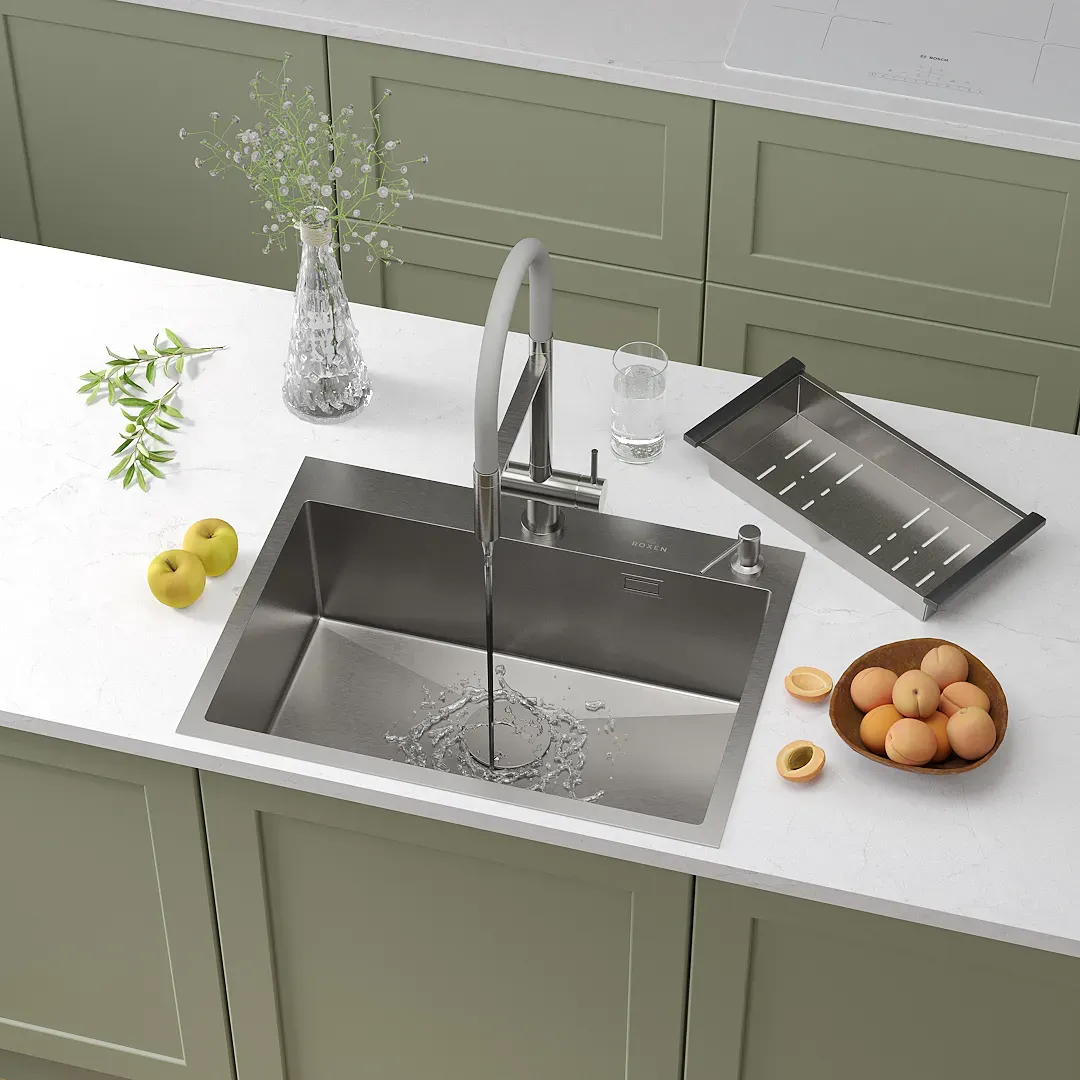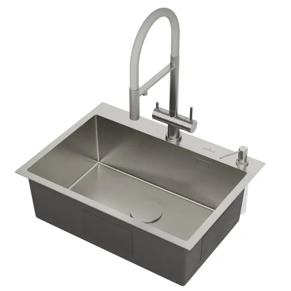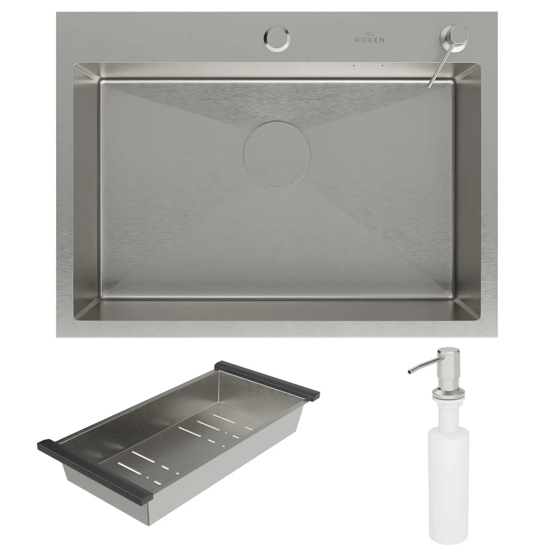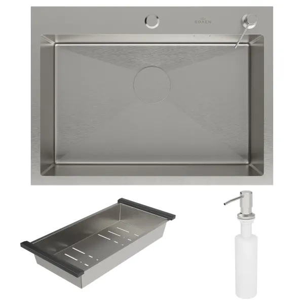 Кухонная мойка Roxen Simple 65х48 с коландером и дозатором в комплекте. Удобная прямоугольная модель без крыла, с глубокой просторной чашей, сочетает в себе стильный современный дизайн и отличные эксплуатационные характеристики. Мойка изготовлена из аустенитной низкоуглеродистой стали марки AISI 304, которая обладает устойчивостью к коррозии, окислению и перепаду температур. Уникальное покрытие Bruch Tech является защитным слоем, устойчивым к истиранию, появлению царапин и механических повреждений. Отличные шумопоглощающие характеристики мойки обеспечиваются шумоподавляющим составом Silent Protection и шумопоглощающими пластинами Soft Silence, которые располагаются по всей чаше мойки.