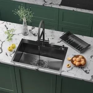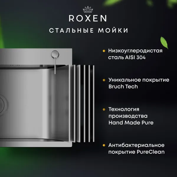 Кухонная мойка Roxen Simple 70 PVD (графит) 70х48 с коландером и дозатором в комплекте. Удобная прямоугольная модель в цвете графит, с большой глубокой чашей, сочетает в себе стильный современный дизайн и отличные эксплуатационные характеристики. Мойка изготовлена из аустенитной низкоуглеродистой стали марки AISI 304, которая обладает устойчивостью к коррозии, окислению и перепаду температур. Отличные шумопоглощающие характеристики мойки обеспечиваются шумоподавляющим составом Silent Protection и шумопоглощающими пластинами Soft Silence, которые располагаются по всей чаше мойки.