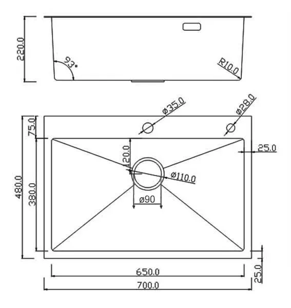 - Размеры мойки, см: 70х48;
