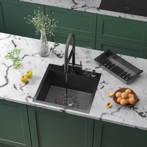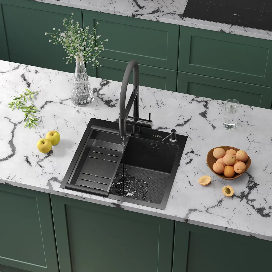 Кухонная мойка Roxen Snake 50 PVD графит с коландером и дозатором в комплекте (текстурное покрытие). Современная вместительная модель премиального сегмента с глубокой чашей и широким отверстием слива, сочетает в себе стильный современный дизайн и отличные эксплуатационные характеристики. Мойка изготовлена из аустенитной низкоуглеродистой стали марки AISI 304, которая обладает устойчивостью к коррозии, окислению и перепаду температур. Толщина стали исключает деформацию и обеспечивает долгий срок эксплуатации. Отличные шумопоглощающие характеристики мойки обеспечиваются шумоподавляющим составом Silent Protection и шумопоглощающими пластинами Soft Silence, которые располагаются по всей чаше мойки.