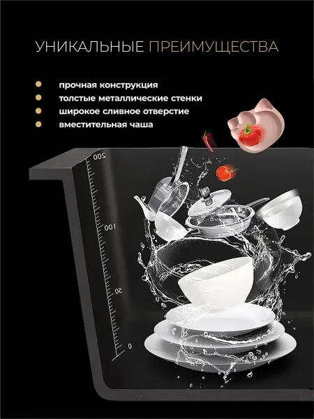 - В мойке сделано 2 заводских отверстия для смесителя и дозатора.