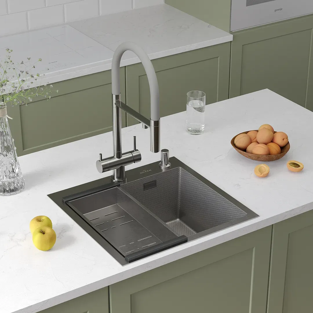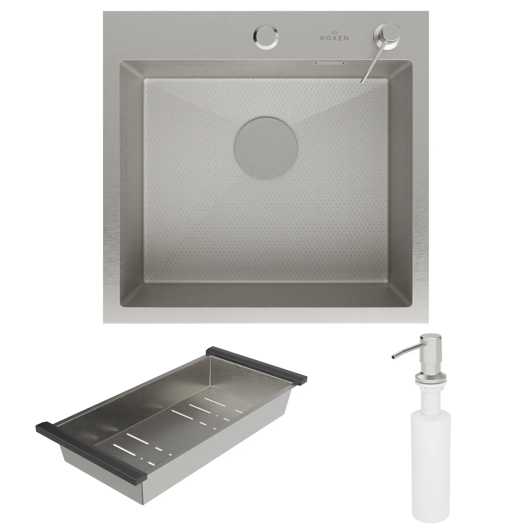 Кухонная мойка Roxen Snake 50х48 (текстурное покрытие) с коландером и дозатором в комплекте. Современная вместительная модель премиального сегмента с глубокой чашей и широким отверстием слива, сочетает в себе стильный современный дизайн и отличные эксплуатационные характеристики. Мойка изготовлена из аустенитной низкоуглеродистой стали марки AISI 304, которая обладает устойчивостью к коррозии, окислению и перепаду температур. Толщина стали исключает деформацию и обеспечивает долгий срок эксплуатации. Уникальное покрытие Bruch Tech является защитным слоем, устойчивым к истиранию, появлению царапин и механических повреждений. Отличные шумопоглощающие характеристики мойки обеспечиваются шумоподавляющим составом Silent Protection и шумопоглощающими пластинами Soft Silence, которые располагаются по всей чаше мойки.