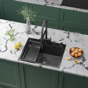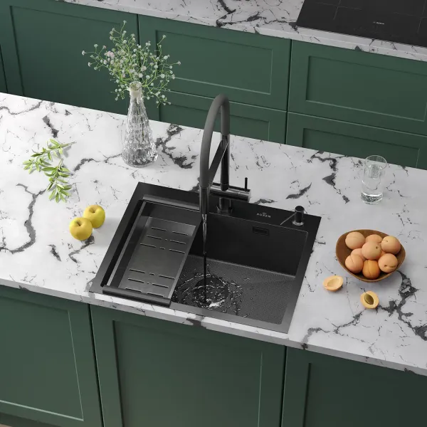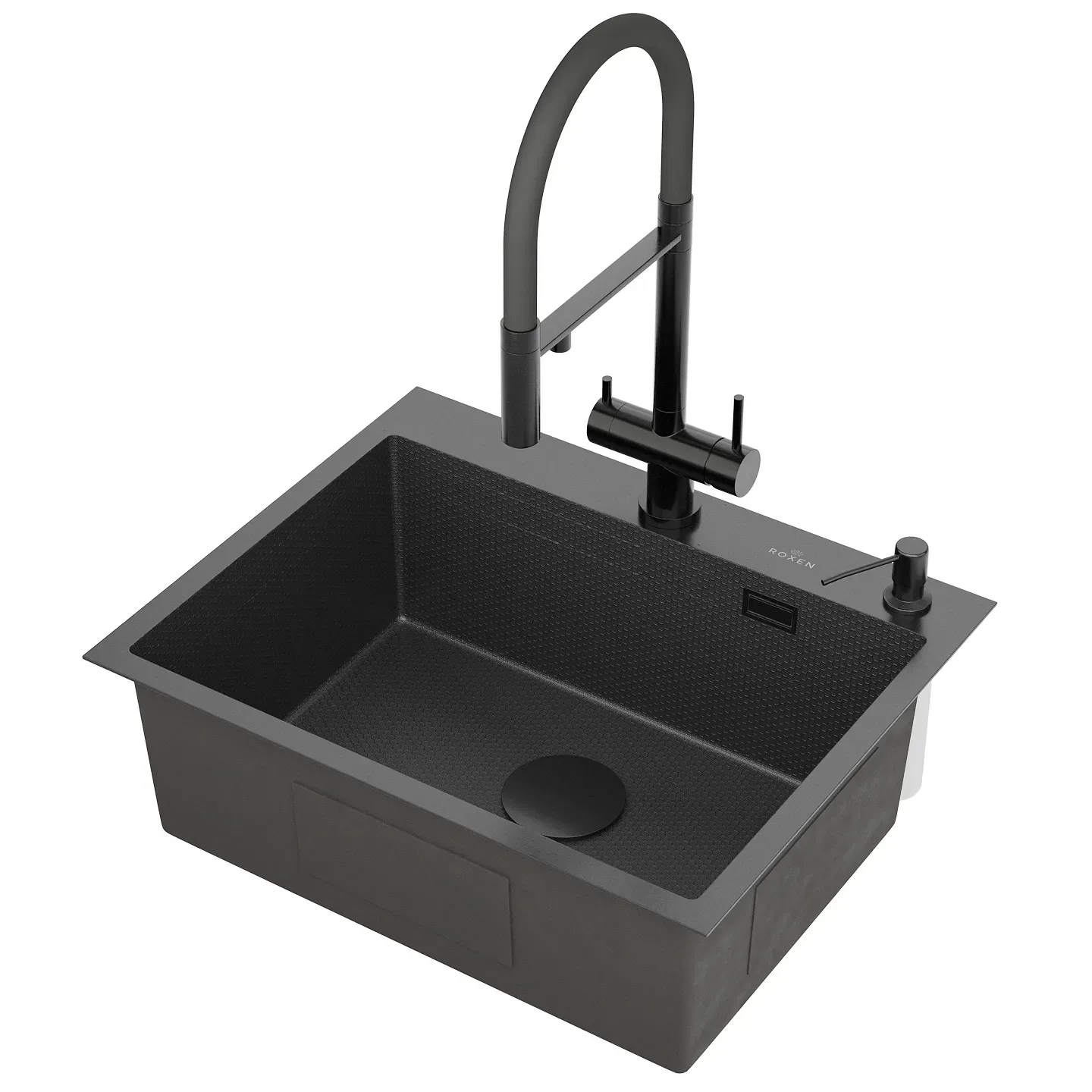 Кухонная мойка Roxen Snake PVD графит с коландером и дозатором в комплекте (текстурное покрытие). Современная вместительная модель премиального сегмента с глубокой чашей и широким отверстием слива, сочетает в себе стильный современный дизайн и отличные эксплуатационные характеристики. Мойка изготовлена из аустенитной низкоуглеродистой стали марки AISI 304, которая обладает устойчивостью к коррозии, окислению и перепаду температур. Толщина стали исключает деформацию и обеспечивает долгий срок эксплуатации. Отличные шумопоглощающие характеристики мойки обеспечиваются шумоподавляющим составом Silent Protection и шумопоглощающими пластинами Soft Silence, которые располагаются по всей чаше мойки.