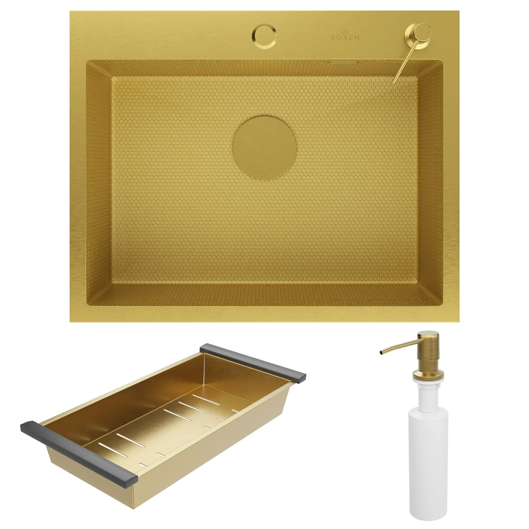 Кухонная мойка Roxen Snake 60 PVD (gold) с коландером и дозатором в комплекте (износостойкое покрытие). Удобная прямоугольная модель в цвете брашированное золото, с глубокой чашей, сочетает в себе стильный современный дизайн и отличные эксплуатационные характеристики. Мойка изготовлена из аустенитной низкоуглеродистой стали марки AISI 304, которая обладает устойчивостью к коррозии, окислению и перепаду температур. Толщина стали исключает деформацию и обеспечивает долгий срок эксплуатации. Отличные шумопоглощающие характеристики мойки обеспечиваются шумоподавляющим составом Silent Protection и шумопоглощающими пластинами Soft Silence, которые располагаются по всей чаше мойки.