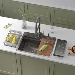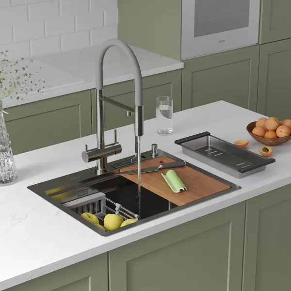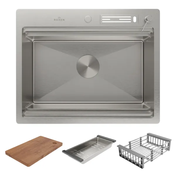 Кухонная мойка Roxen Stage 60 в комплекте с держателем для ножей, двумя коландерами, разделочной доской и дозатором - это удобная модель с глубокой чашей, сочетает в себе стильный современный дизайн, функциональность и отличные эксплуатационные характеристики. Удобная вместительная чаша дает возможность расположить коландеры на двух уровнях. Держатель для ножей имеет водоотводящую коробку, что поможет ножам всегда оставаться сухими и продлить срок их службы. Мойка изготовлена из аустенитной низкоуглеродистой стали марки AISI 304, которая обладает устойчивостью к коррозии, окислению и перепаду температур. Уникальное покрытие Bruch Tech является защитным слоем, устойчивым к истиранию, появлению царапин и механических повреждений. Отличные шумопоглощающие характеристики мойки обеспечиваются шумоподавляющим составом Silent Protection и шумопоглощающими пластинами Soft Silence, которые располагаются по всей чаше мойки.
