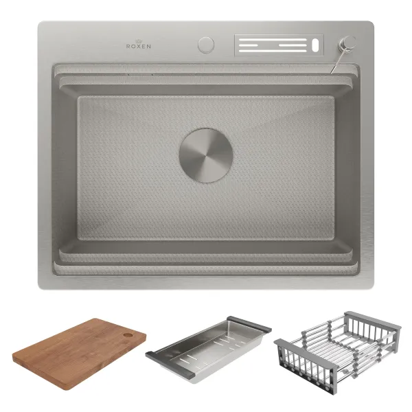 Кухонная мойка RoxenBath Stage 60-S в комплекте с держателем для ножей, двумя коландерами, разделочной доской и дозатором - это удобная модель с глубокой чашей, сочетает в себе стильный современный дизайн, функциональность и отличные эксплуатационные характеристики. Удобная вместительная чаша дает возможность расположить коландеры на двух уровнях. Держатель для ножей имеет водоотводящую коробку, что поможет ножам всегда оставаться сухими и продлить срок их службы. Мойка изготовлена из аустенитной низкоуглеродистой стали марки AISI 304, которая обладает устойчивостью к коррозии, окислению и перепаду температур. Уникальное покрытие Bruch Tech является защитным слоем, устойчивым к истиранию, появлению царапин и механических повреждений. Отличные шумопоглощающие характеристики мойки обеспечиваются шумоподавляющим составом Silent Protection и шумопоглощающими пластинами Soft Silence, которые располагаются по всей чаше мойки.