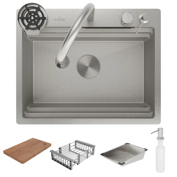 Многофункциональная кухонная мойка RoxenBath Stage Plus 560250-60-S - это удобная функциональная модель с глубокой чашей в цвете "сатин" с текстурной поверхностью, сочетает в себе стильный современный дизайн и отличные эксплуатационные характеристики. Вместительная чаша дает возможность расположить коландеры и доску на двух уровнях. Мойка изготовлена из аустенитной низкоуглеродистой стали марки AISI 304, которая обладает устойчивостью к коррозии, окислению и перепаду температур. Уникальное покрытие Bruch Tech является защитным слоем, устойчивым к истиранию, появлению царапин и механических повреждений. Отличные шумопоглощающие характеристики мойки обеспечиваются шумоподавляющим составом Silent Protection и шумопоглощающими пластинами Soft Silence, которые располагаются по всей чаше мойки.