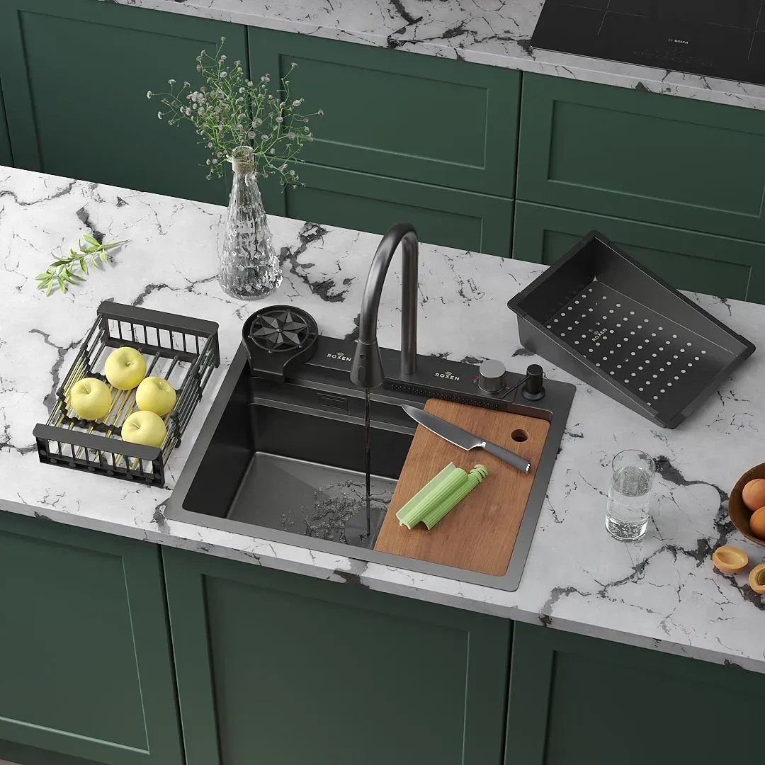 Многофункциональная кухонная мойка RoxenBath Stage Plus 560250-60B - это удобная функциональная модель с глубокой чашей в цвете "графит", сочетает в себе стильный современный дизайн и отличные эксплуатационные характеристики. Вместительная чаша дает возможность расположить коландеры и доску на двух уровнях. Мойка изготовлена из аустенитной низкоуглеродистой стали марки AISI 304, которая обладает устойчивостью к коррозии, окислению и перепаду температур. Уникальное покрытие Bruch Tech является защитным слоем, устойчивым к истиранию, появлению царапин и механических повреждений. Отличные шумопоглощающие характеристики мойки обеспечиваются шумоподавляющим составом Silent Protection и шумопоглощающими пластинами Soft Silence, которые располагаются по всей чаше мойки.