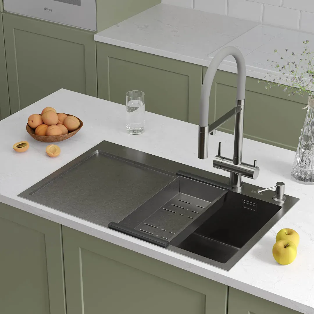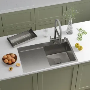 Кухонная мойка Roxen Vespa 78х48 правосторонняя с коландером и дозатором в комплекте. Удобная и практичная модель с большим крылом (с левой или правой стороны), с глубокой квадратной чашей, сочетает в себе стильный современный дизайн и отличные эксплуатационные характеристики. Мойка изготовлена из аустенитной низкоуглеродистой стали марки AISI 304, которая обладает устойчивостью к коррозии, окислению и перепаду температур. Уникальное покрытие Bruch Tech является защитным слоем, устойчивым к истиранию, появлению царапин и механических повреждений. Отличные шумопоглощающие характеристики мойки обеспечиваются шумоподавляющим составом Silent Protection и шумопоглощающими пластинами Soft Silence, которые располагаются по всей чаше мойки.