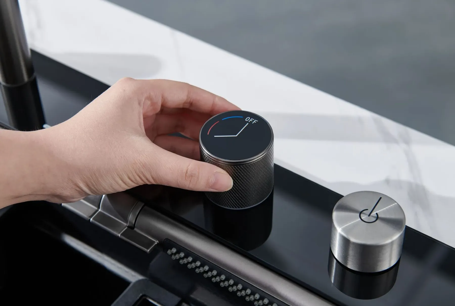 Панель со встроенным LED-дисплеем, показывает текущую температуру воды и время. Температура регулируется поворотной ручкой. Дисплей не требует подключения к электричеству, так как его работа связана с напором воды.