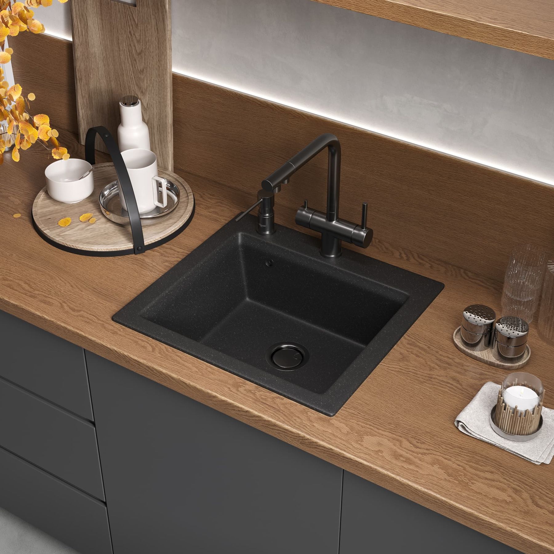 Удобная вместительная мойка подходит для установки как в угловой шкаф кухни, так и в прямые модули.