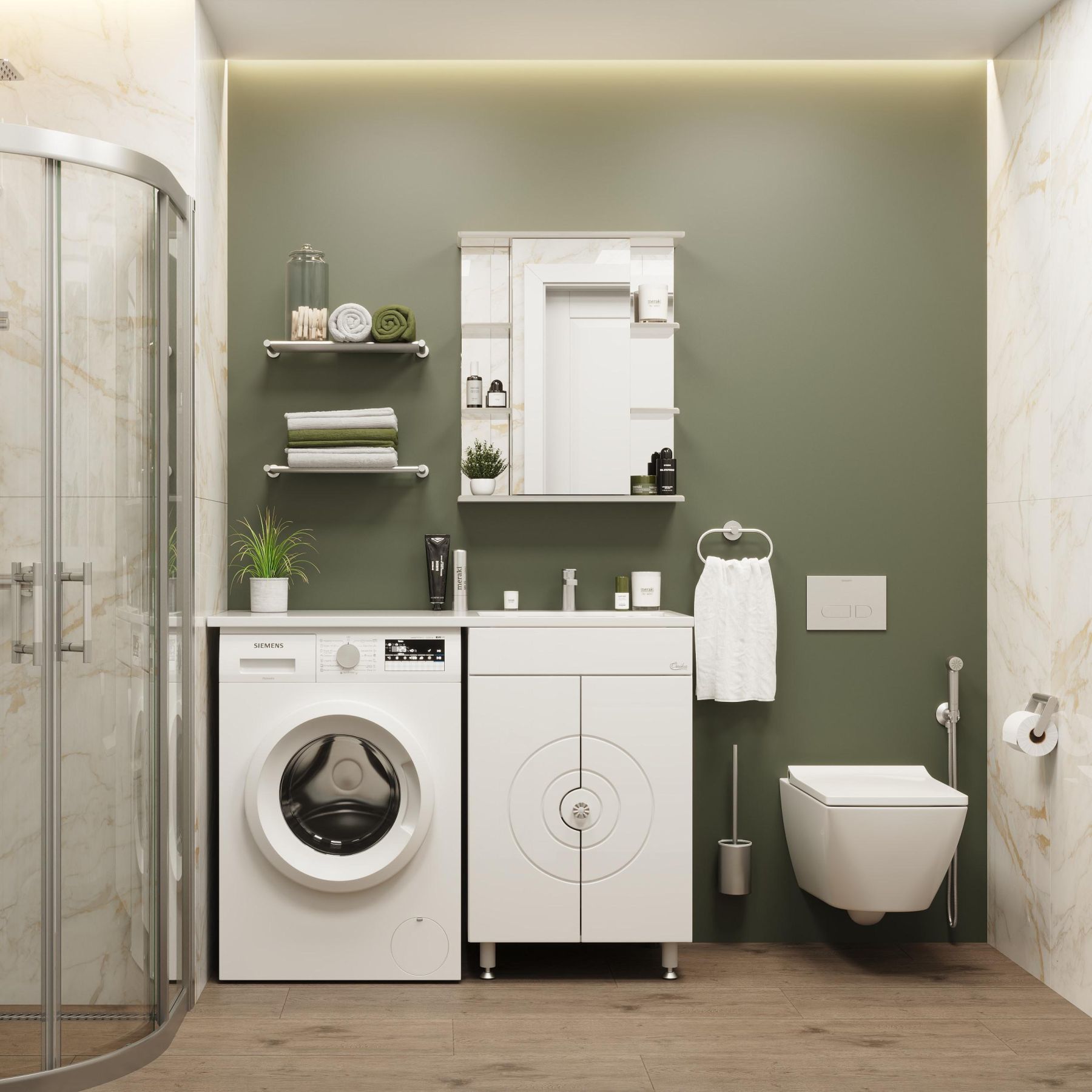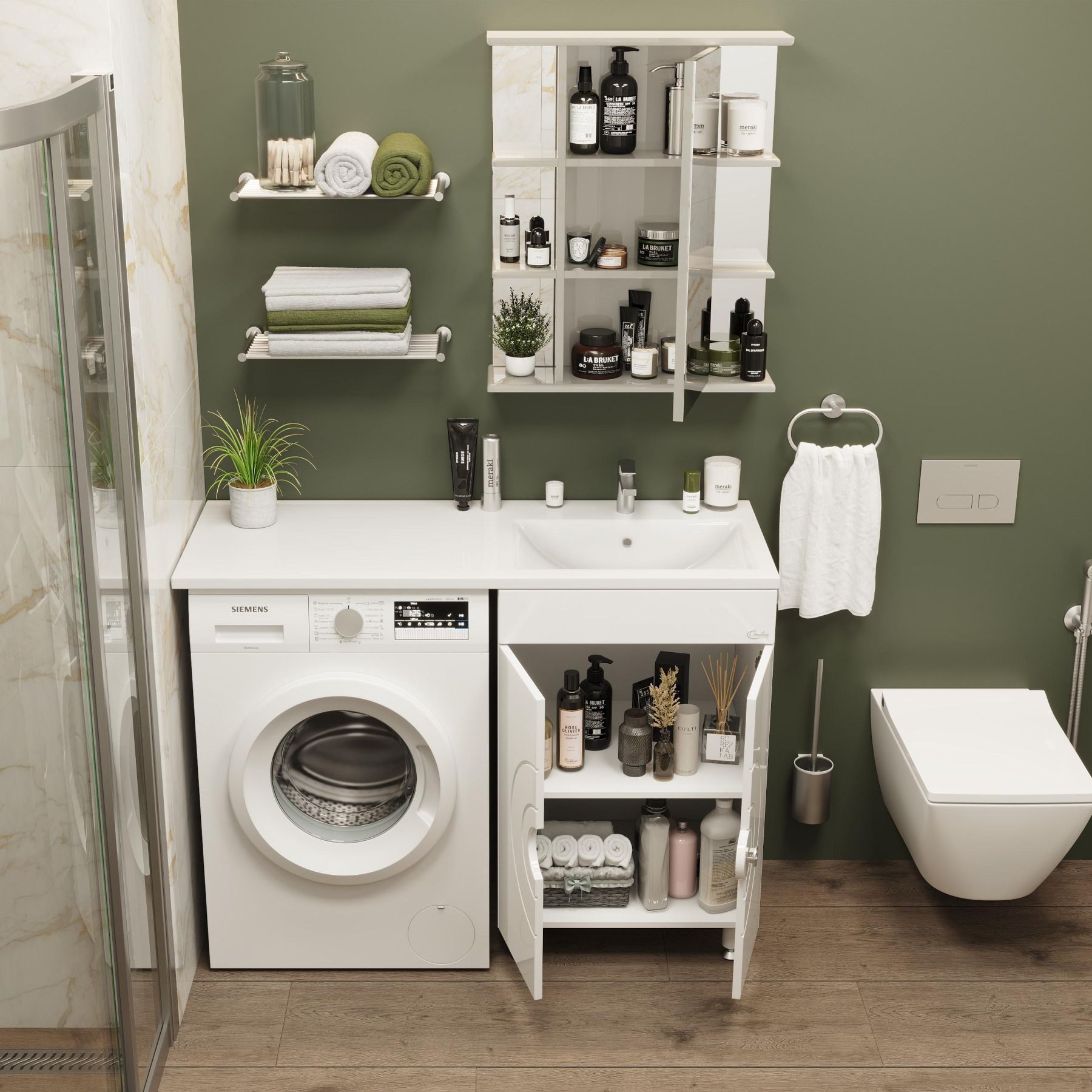 Фасад украшают 2 распашных фигурных двери, украшенные изящной фрезеровкой и снабженные системой плавного закрывания, за ними - большое пространство для хранения банных принадлежностей или бытовой химии, разделенное горизонтальной полочкой.