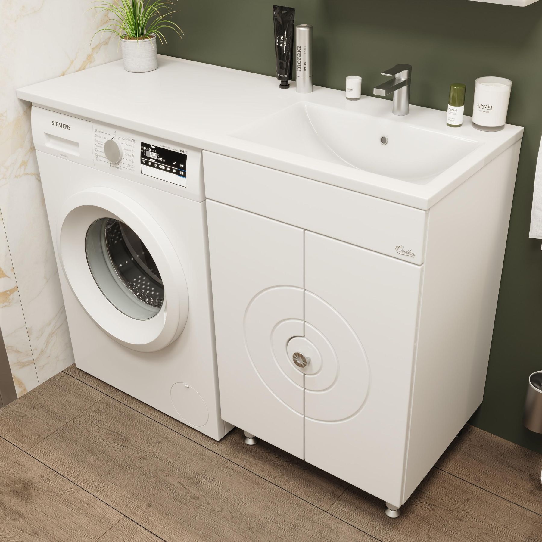 Напольная тумба Onika Космос 60 идеально подходит для небольших санузлов и станет прекрасным решением для совмещения со стиральной машиной.