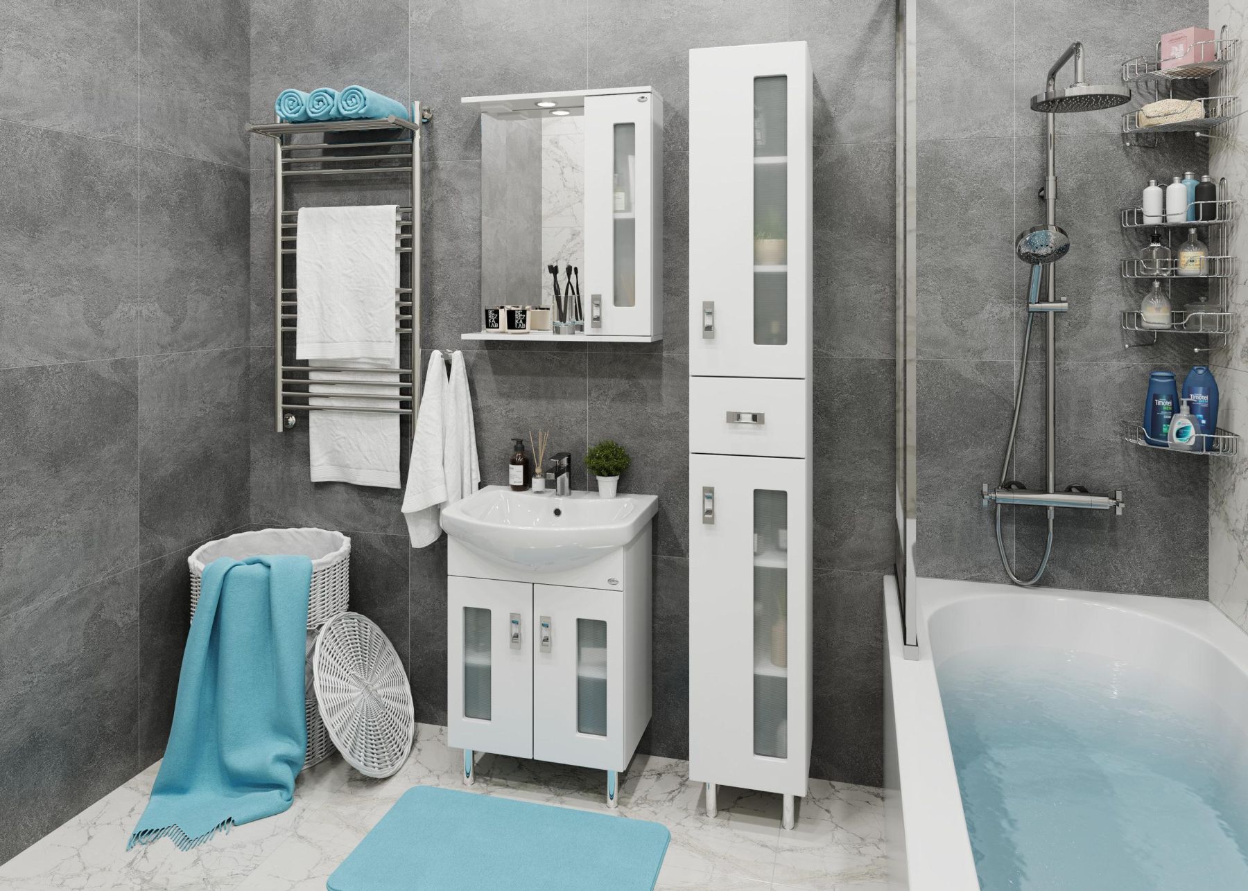 Белоснежный глянцевый цвет фасада в сочетании со вставками из матового стекла и хромированными ручками необычной формы придадут ванной комнате ощущение свежести, чистоты и уюта.