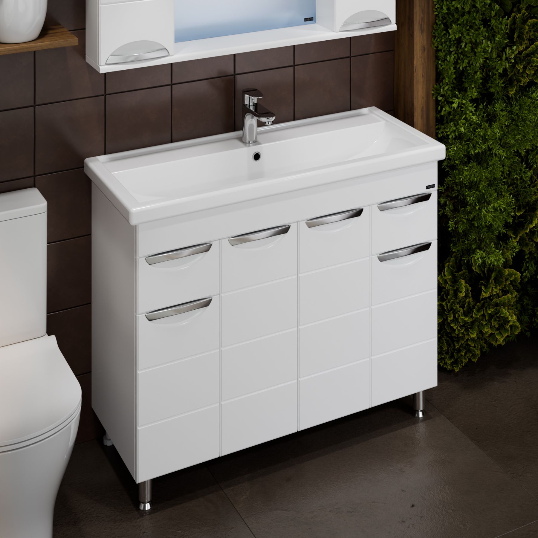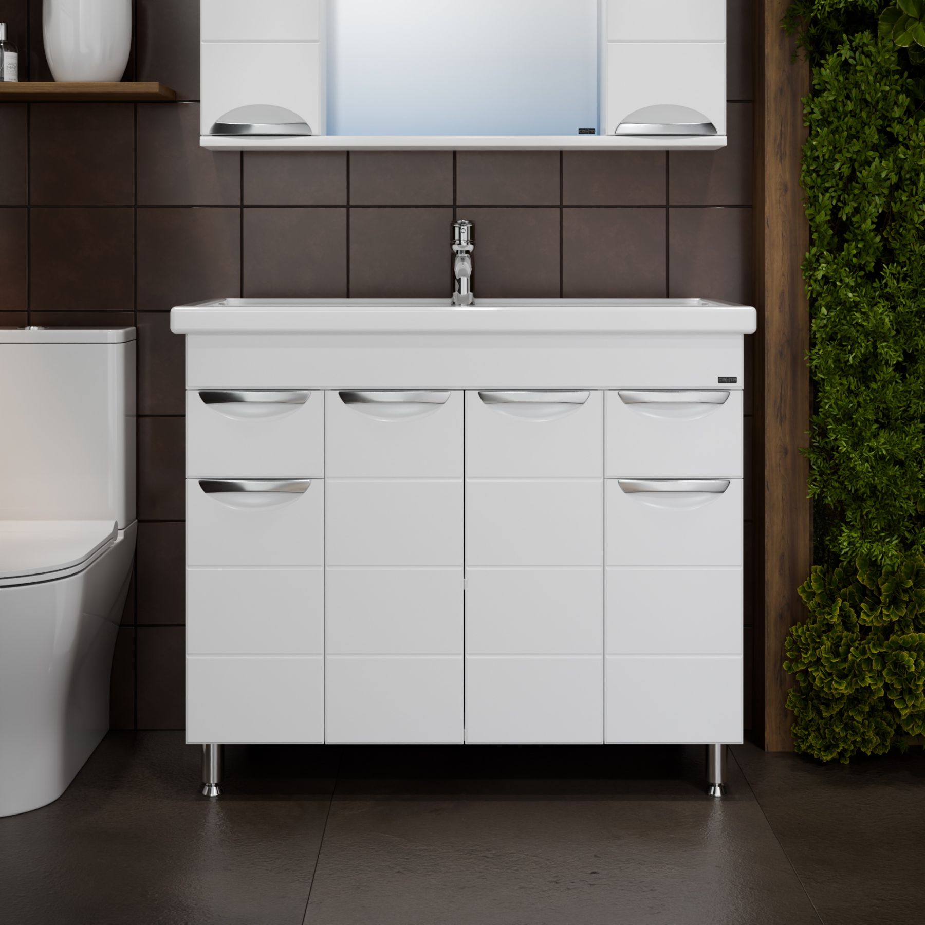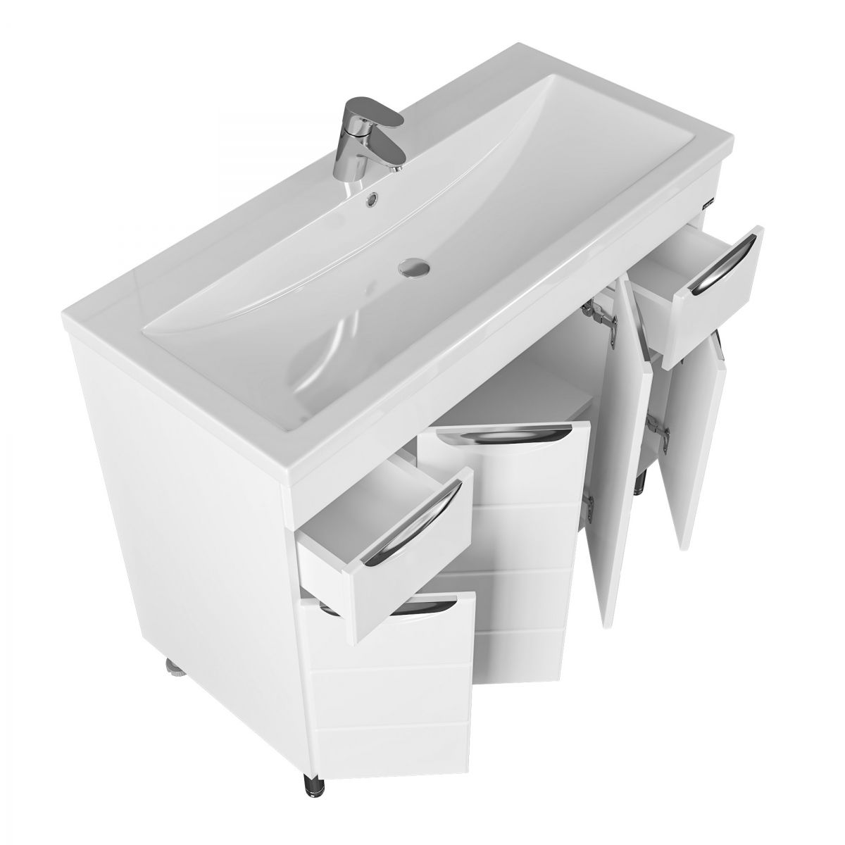 Тумба под раковину Санта Родос 100 под умывальник Фостер 100 — это воплощение современного и стильного дизайна, созданное специально для вашей ванной комнаты. Она оборудована четыремя дверцами и двумя ящиками, что обеспечивает лёгкий доступ к её содержимому. Фасады тумбы выполнены из МДФ с фрезеровкой и покрыты глянцевой ПВХ-пленкой, а боковины — из белого влагостойкого ЛДСП. Хренение за дверцами и ящиками позволяет организовать пространство с максимальной функциональностью.