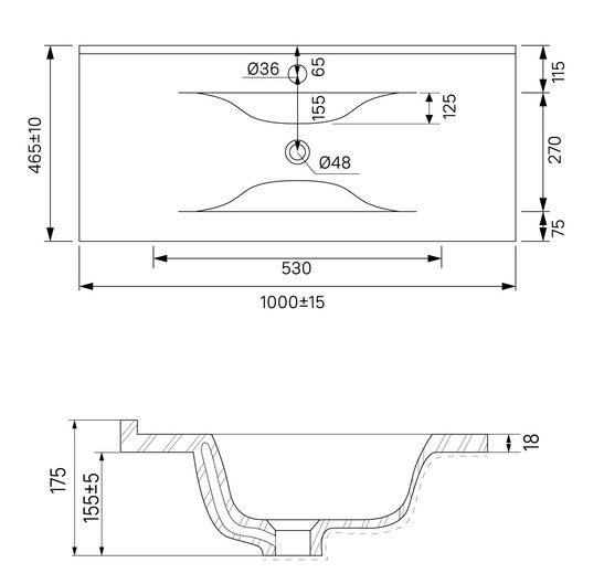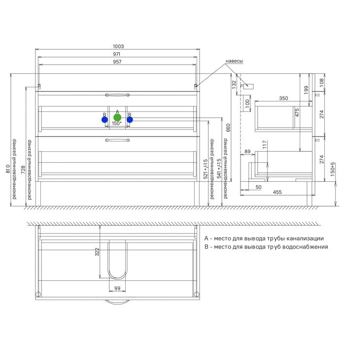Два выдвижных ящика закрываются плавно и бесшумно благодаря скрытым направляющим с доводчиками немецкого производства. Ограничитель под сифон в верхнем ящике позволяет эффективнее использовать его пространство.