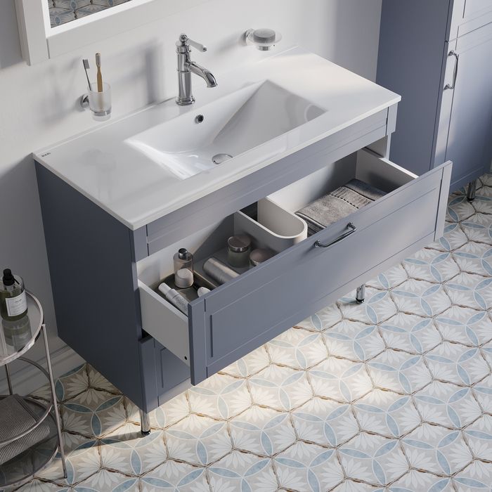 Вместительная напольная тумба Oxford изысканного светло-серого цвета – модное сочетание классического стиля и стиля ретро. Она органично впишется в интерьер благодаря элегантному фрезерованному фасаду и узнаваемому дизайну. В комплекте плоский эргономичный умывальник.
