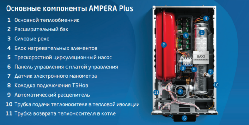 Электрический котел BAXI AMPERA Plus – это современная мини-котельная, которая включает: расширительный бак, насос и группу безопасности. Модельный ряд начинается с котлов мощностью 6 и 9 кВт, они могу быть как однофазными, так и трехфазными. Модели от 12 до 36 кВт поставляются в трёхфазном исполнении. Одним из ключевых усовершенствований в новых моделях является улучшенная модуляция мощности. Количество ступеней модуляции BAXI AMPERA Plus зависит от мощности котла. Модели мощностью 6 кВт имеют 3 ступени, модели от 9 до 24 кВт - 6 ступеней, а модели от 30 до 36 кВт - 9 ступеней. Это позволяет более точно регулировать мощность котла в соответствии с потребностями, что обеспечивает экономию энергопотребления и повышает комфорт и безопасность. AMPERA Plus оснащен разъемом OpenTherm и дин-рейкой внутри котла для быстрой и удобной установки системы удаленного управления BAXI Connect+.