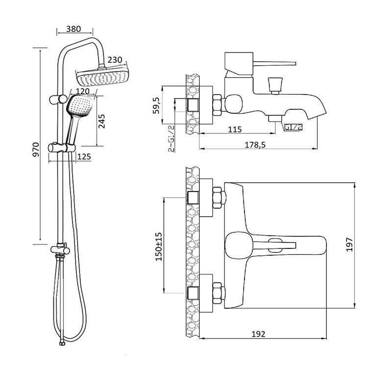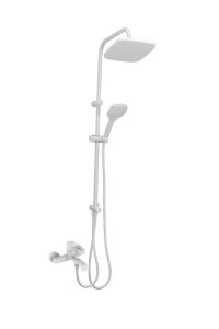 Душевая система с смесителем для ванны/душа в цвете белый глянец: верхний душ (230х230 мм) создаёт эффект тропического дождя, что дарит непередаваемые эмоции во время ежедневных банных процедур. Ручной душ 120 мм (1 режим) на гибком полутораметровом шланге (в металлической оплетке) с защитой от перекручивания. Держатели верхнего и ручного душа с регулировкой угла наклона, штанга 970 мм. Подвижные детали отличаются долговечностью. Фиксируется душевая система непосредственно на стене, что позволяет рационально использовать ограниченное пространство ванной комнаты.