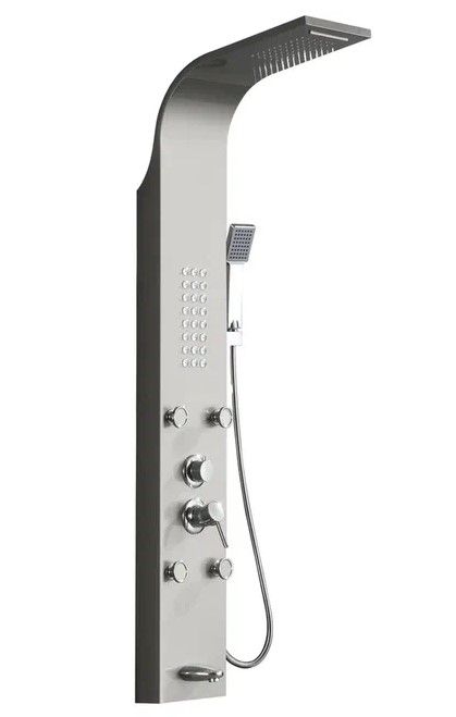 - Комплектация: душевая панель, душевая лейка, смеситель, шланг для душа, верхний душ, крепеж, инструкция
