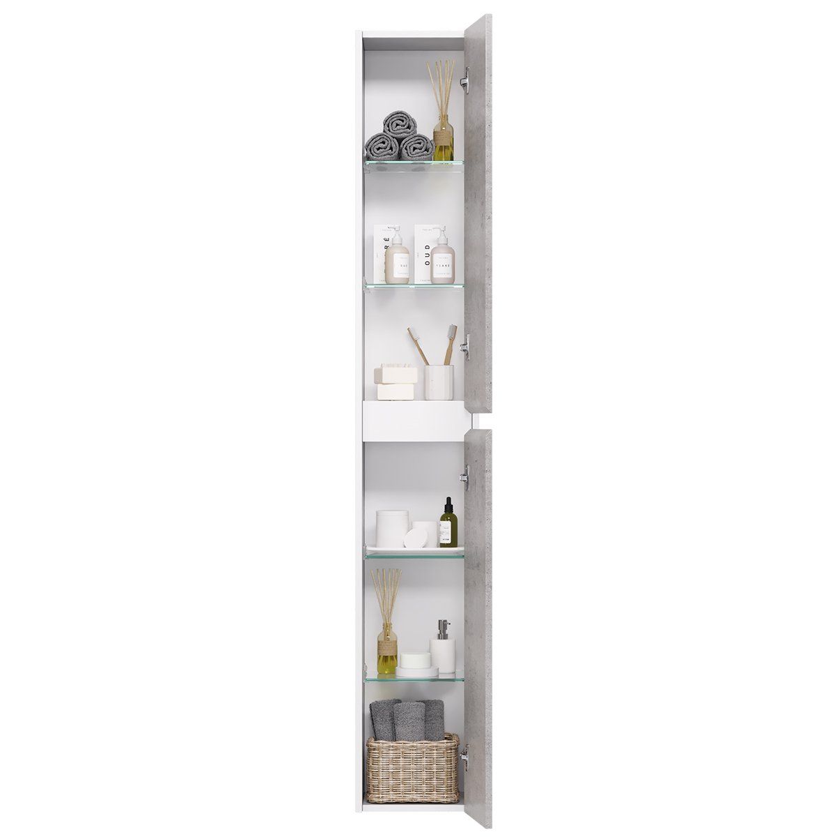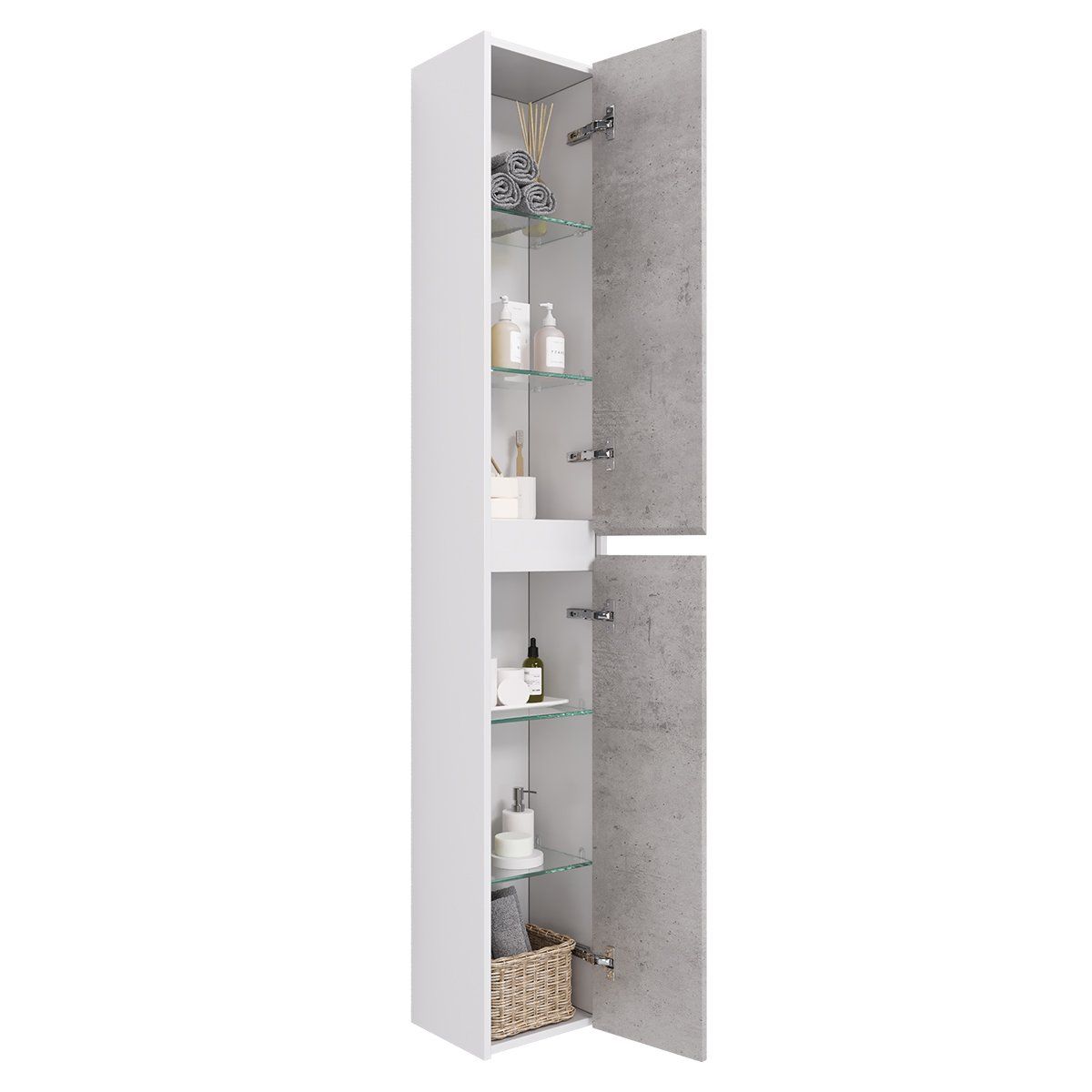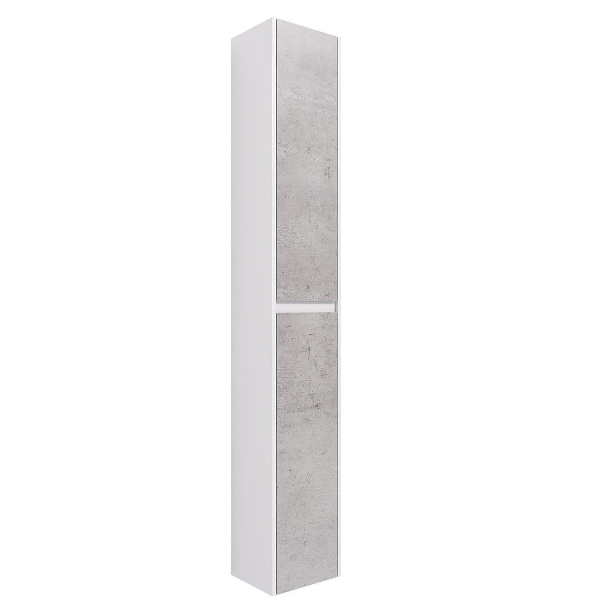 Пенал SLIM, 30 см, подвесной/напольный, универсальный, 2 дверцы, 4 стеклянные полки, бетон/белый глянец
