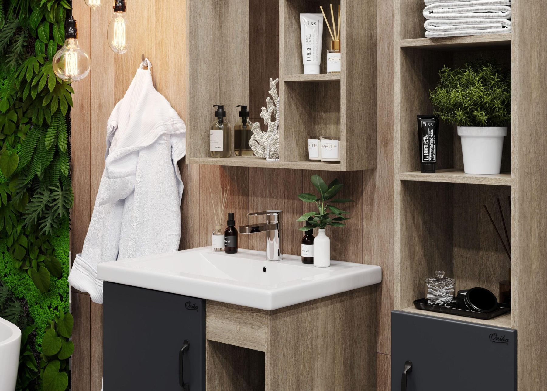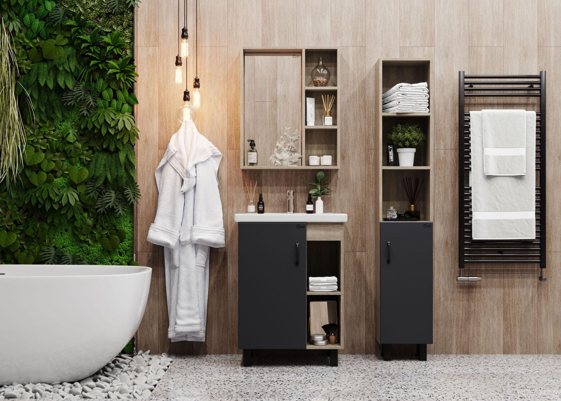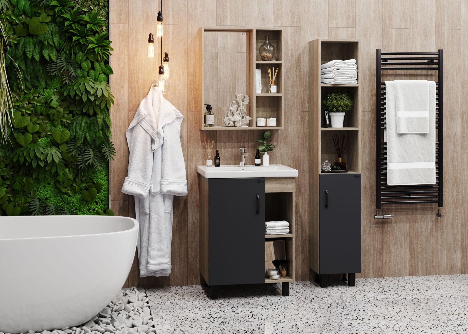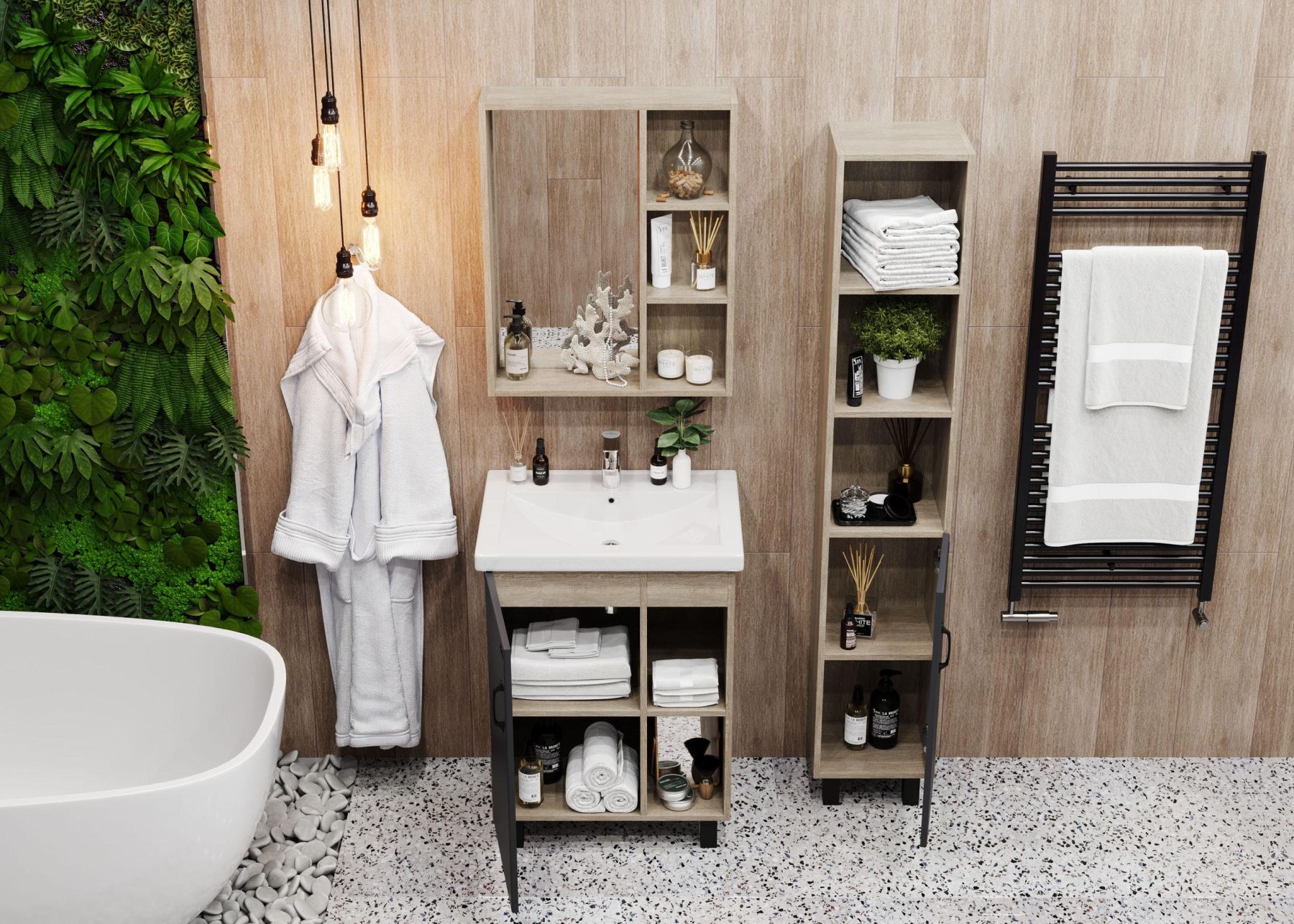 Открытые полки сверху обеспечивают быстрый доступ к часто используемым аксессуарам, а пространство за распашной дверцей снизу, снабженной системой плавного закрывания, станет удобным местом для хранения различных бытовых принадлежностей.
