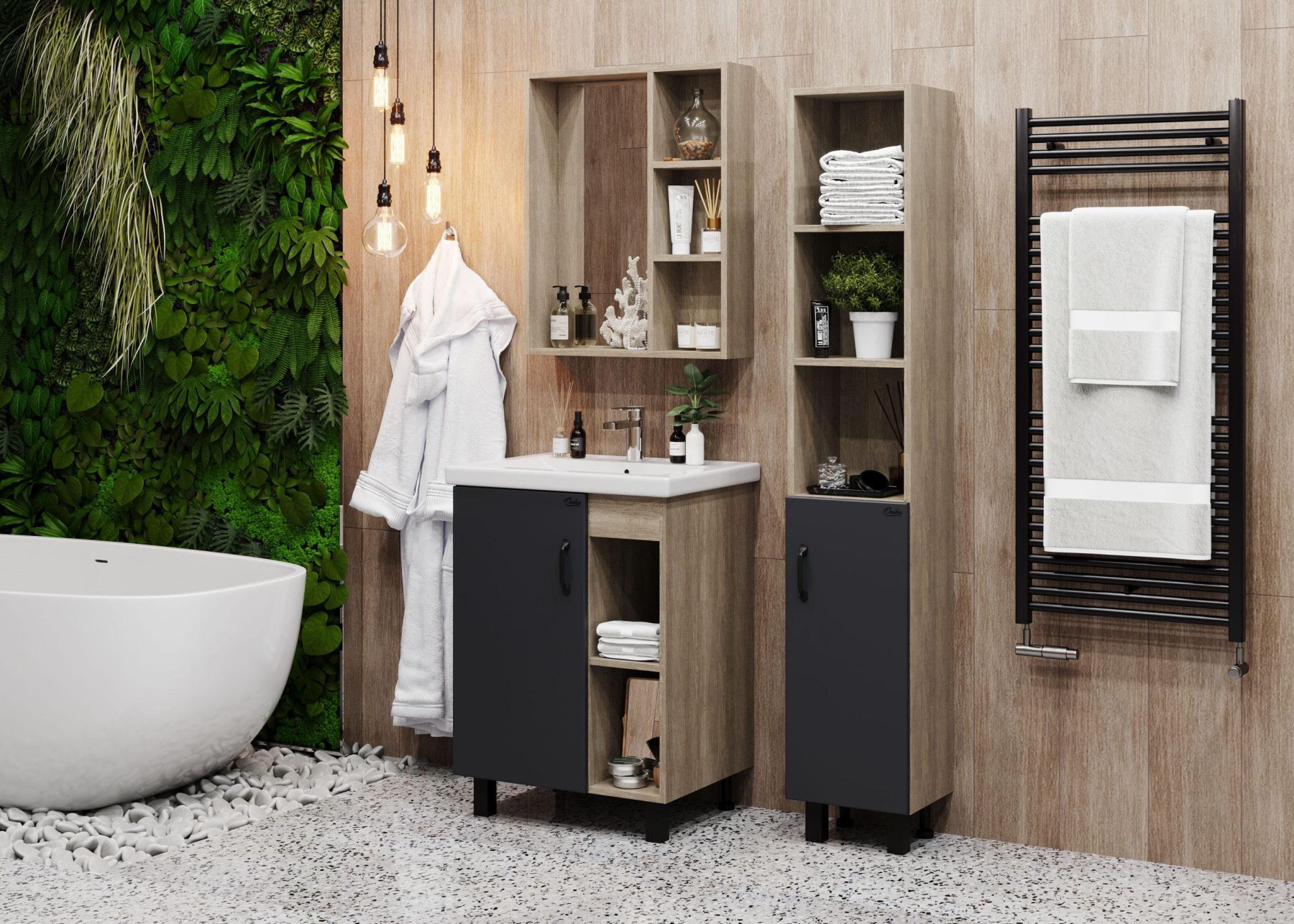 Напольный пенал для ванной комнаты пенал Onika ТИМБЕР 30 удачно сочетаются контрастные цвета и фактуры: серый матовый фасад с покрытием SoftTouch, корпус цвета дуб сонома с роскошной текстурой, черная матовая металлическая фурнитура.