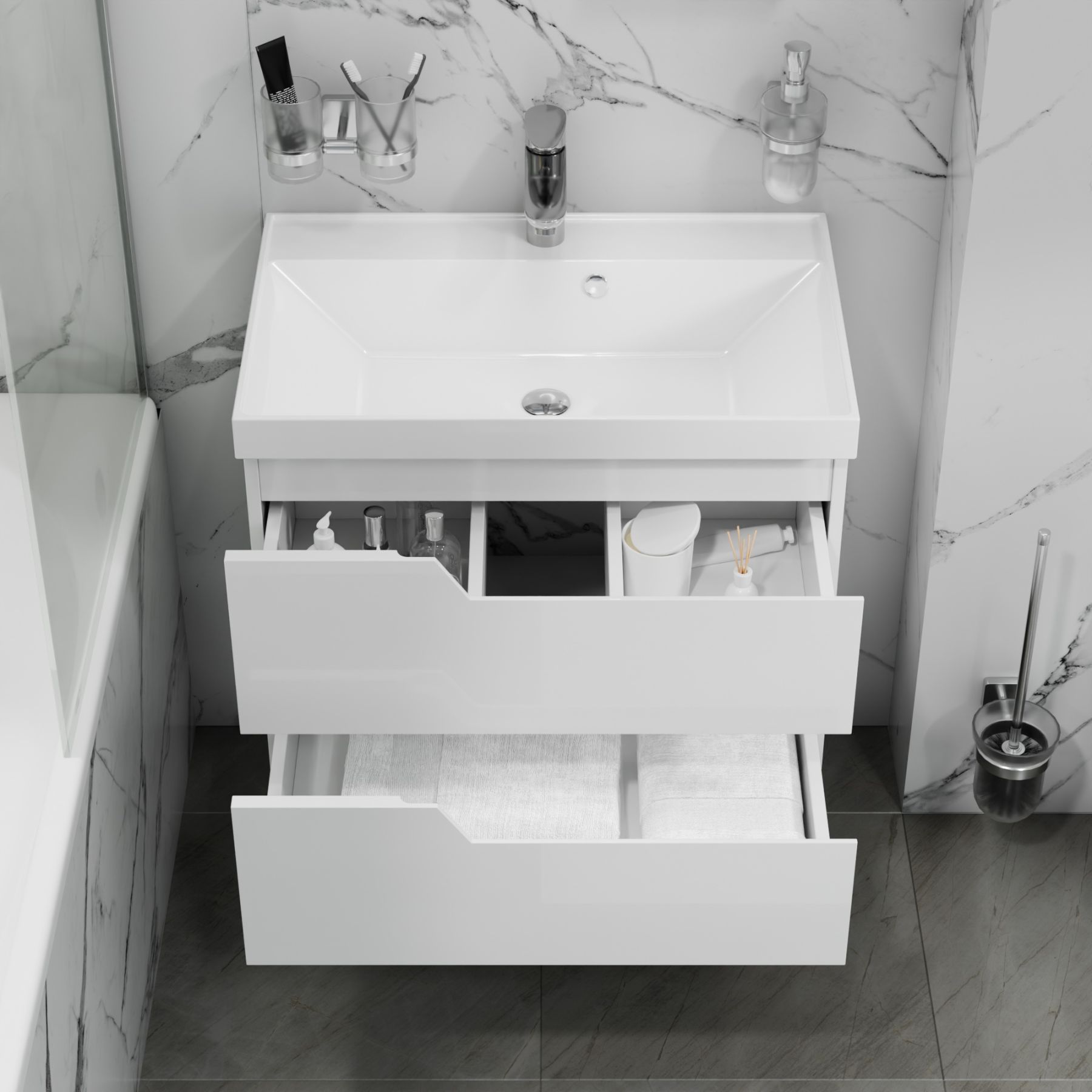 · Комфорт использования: Встроенные доводчики на ящиках обеспечивают плавное закрывание и защиту от шума