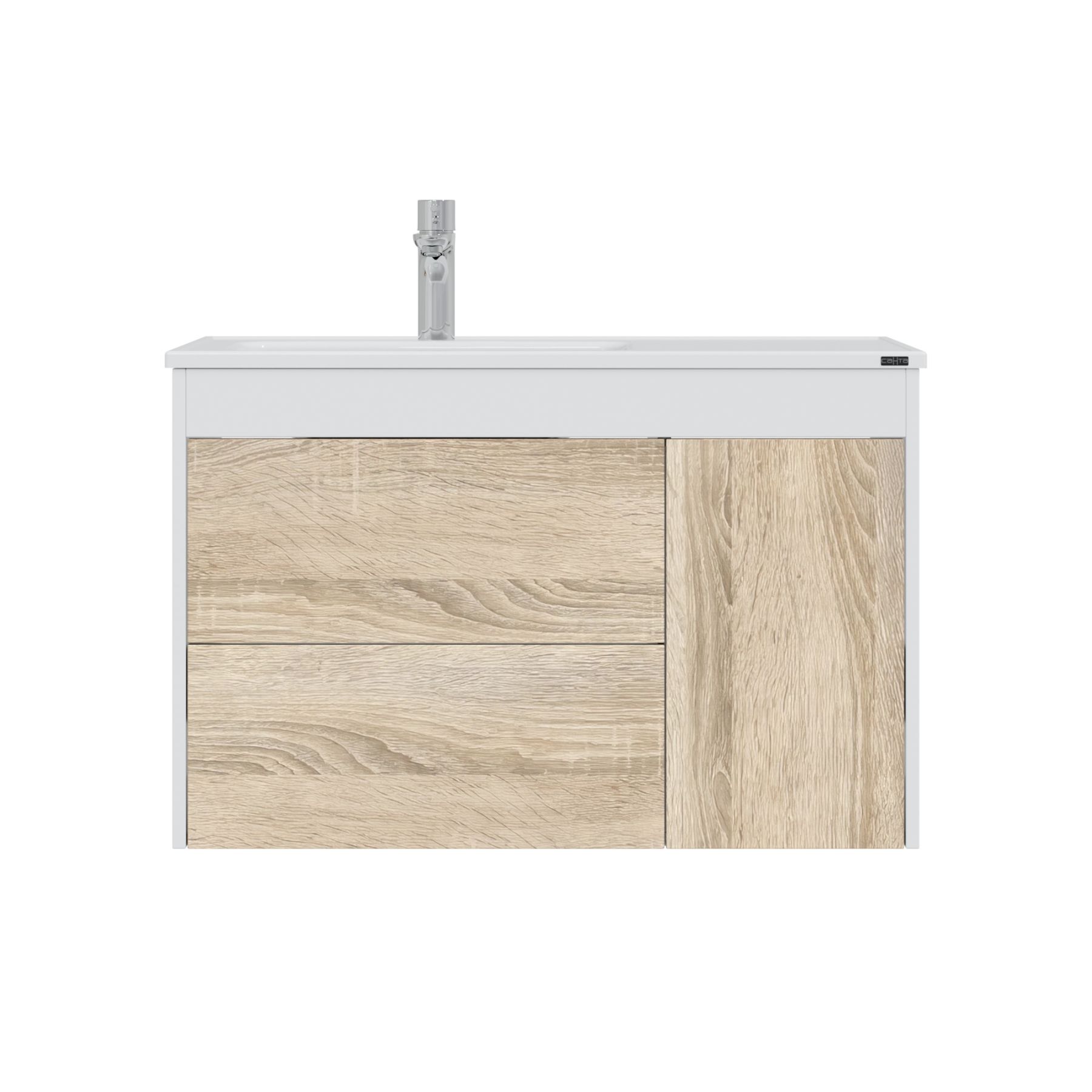 Подвесная тумба Меркурий 90 под умывальник Венера 90. Фасады тумбы выполнены из ЛДСП с ламинацией, боковины и верхняя планка покрыты матовой белой эмалью. Выдвижные ящики и дверь открываются с помощью механизма "Push to open" (нажать, что бы открыть), на дверке петли с плавным закрыванием.