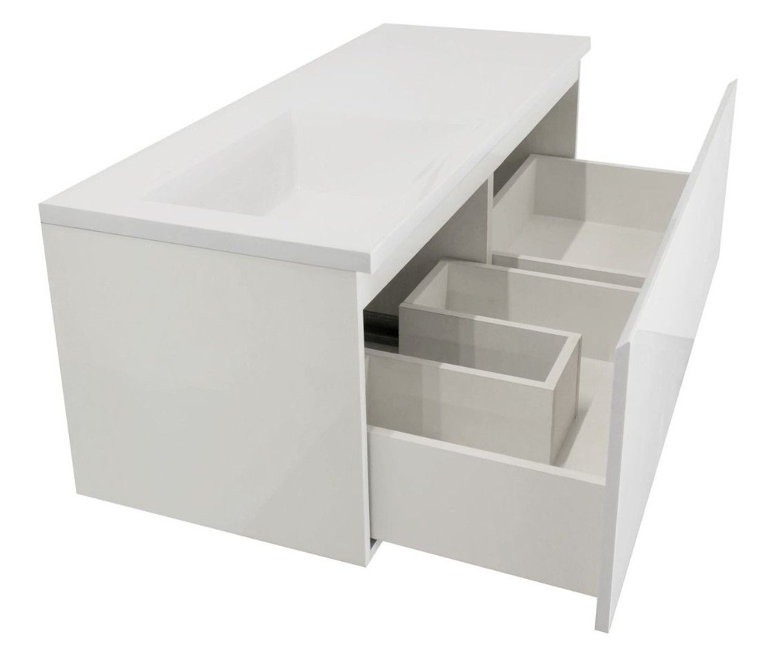 Отличительной особенностью коллекции Dallas Luxe является один большой функциональный ящик, который располагается по всей длине раковины. Ящик разделяется на две зоны, тем самым дает возможность хранения как крупных, так и мелких вещей. Стильная тумба впишется в любой современный интерьер и создаст комфорт в использовании. Подвесная система монтажа позволяет более эффективно использовать пространство, не мешает уборке в ванной комнате, не нарушает раскладку плитки на полу.