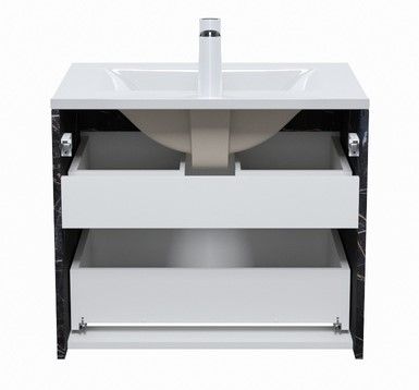 Стильная подвесная тумба Cloud из влагостойкой ЛДСП, где гармонично сочетаются боковины под черный мрамор, матовые белые фасады с интегрированными ручками и тонкий умывальник. Обновление популярной коллекции мебели Cloud и украшение современной ванной.