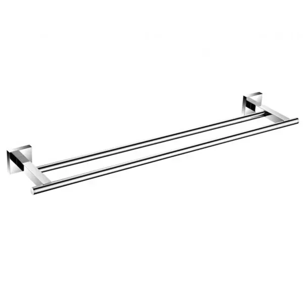 Держатель для полотенец Aquanet 6124D (60 см, двухрядный) рассчитан на два изделия, располагающиеся параллельно друг другу. Является типичным образцом брутального дизайна с рельефной угловатостью деталей, зеркальными хромированными поверхностями, основательностью конструкции. Крепежные детали для настенного монтажа скрыты за двумя квадратными элементами.